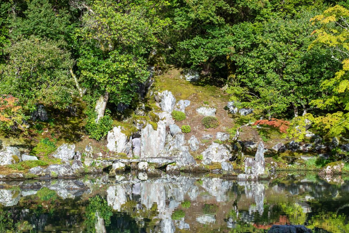 次に、方丈の縁側を降りて、池の前に立って見ると、先ほどよりも庭園の木々に臨場感が感じられ、個々の美しさが際立ちます。見る場所によっても全く違った美しさを楽しむことができるのも、大きな魅力ですね。池の水面のさざなみが美しく、心落ち着く時間が過ごせます。