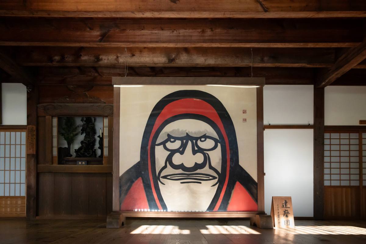 それでは、諸堂参拝の流れをみていきましょう。こちらは、諸堂参拝の入り口となる、庫裏の玄関正面に置かれた達磨図。天龍寺の前管長(前住職)である平田精耕老師の筆によるもので、モチーフは禅宗の初祖・菩提達磨大師。達磨が伝えた禅の宗風を象徴しており、まさに天龍寺の顔。口をぎゅっと結んで上を見ている特徴的な表情や、ダイナミックな絵のタッチがインパクト抜群です。