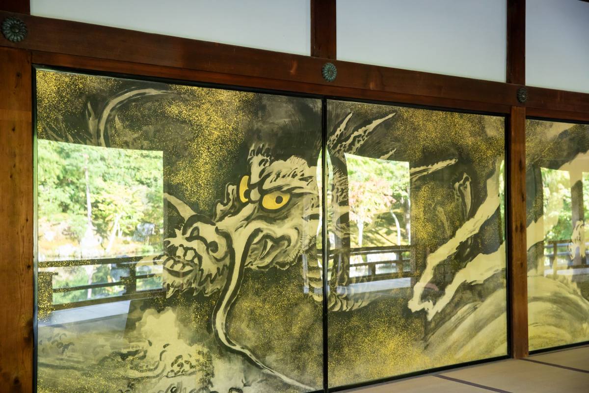 庫裏を過ぎると、次は大方丈へ進みます。写真は、大方丈の東西を仕切る襖の雲龍図。昭和32年(1957)に絵師の若狭物外によって描かれました。きらびやかな金色と龍の組み合わせが見事です。向かい側に広がる庭園の映り込みによって龍と庭園が一緒に楽しめるところもみどころ。この大方丈は、御本尊の木造釈迦如来坐像が安置されている場所です。木造釈迦如来坐像は天龍寺の造営よりもはるかに古い平安時代後期の作とされており、天龍寺に祀られる仏像の中で最も古い像。制作された具体的な年代や作成の背景などは謎に包まれているのだそうです。