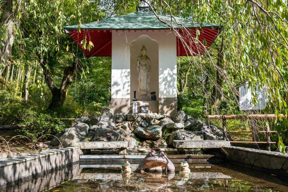 また、多宝殿の横にあるのが、「平和観音と愛の泉」という地中よりわいた霊泉池。泉の中に平和観音を守るカエルが三匹並び、後ろに平和観音像が安置されています。このカエル像の前の万倍椀にお金を投げて入ると、倍になって返ってくるそう。ぜひ挑戦してみてください。