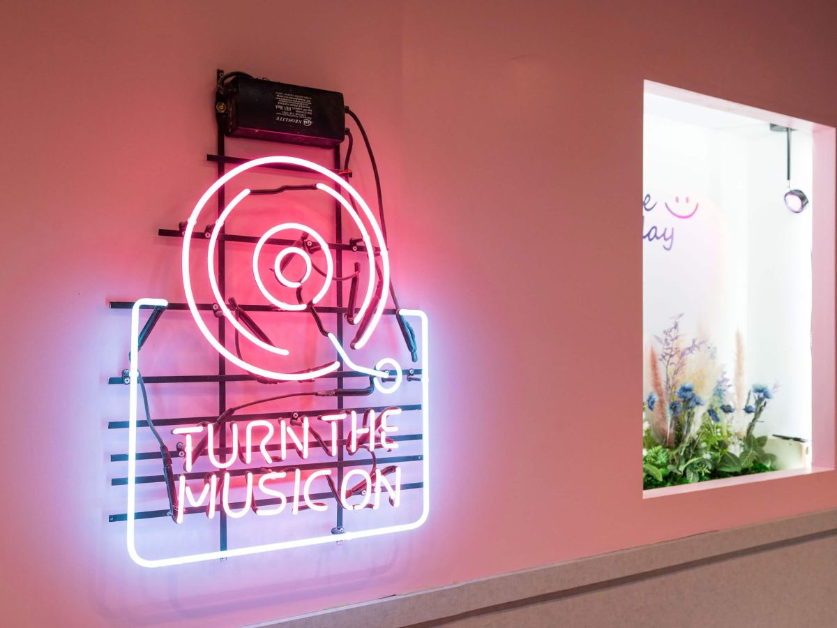レコード型のネオンサインやDJブースをイメージしたドラム缶のテーブル席なども、ミュージックカフェならでは。