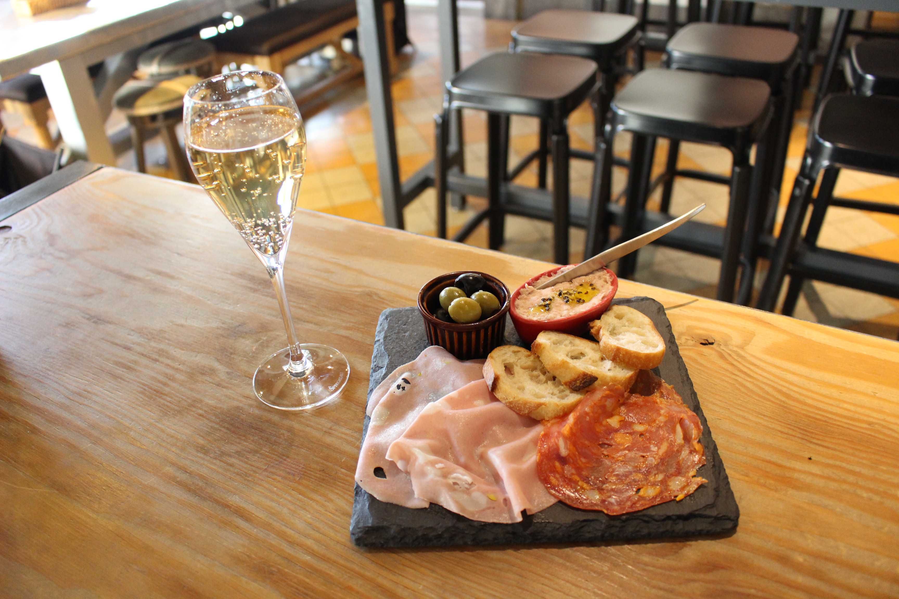 「AWAKE ATE SET」は、バルエリア限定のお得なセット。オリーブマリネやナポリサラミ、パルマ産生ハムのリエットなど4種のおつまみに、ドリンクが1杯付いてきます。盛り付けられた黒のプレートもおしゃれ!