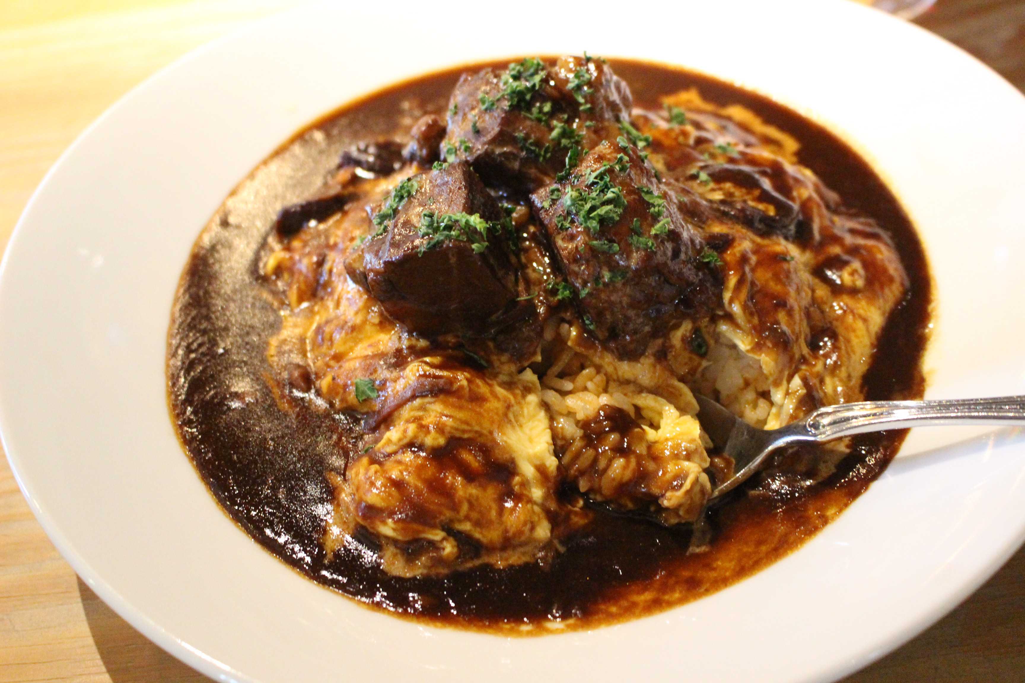 「名物牛肉煮込みのオムライス」は、ぜひ食べたいところ。特製のトマトソースで味付けしたバターライスの上に玉子を重ね、牛バラ肉のデミグラスソースをかけています。赤ワインをたっぷり使ったちょっとビターな風味のデミグラスソースで、お酒にも合うオムライス。とろとろの玉子と、お肉の軟らかさがたまりません!