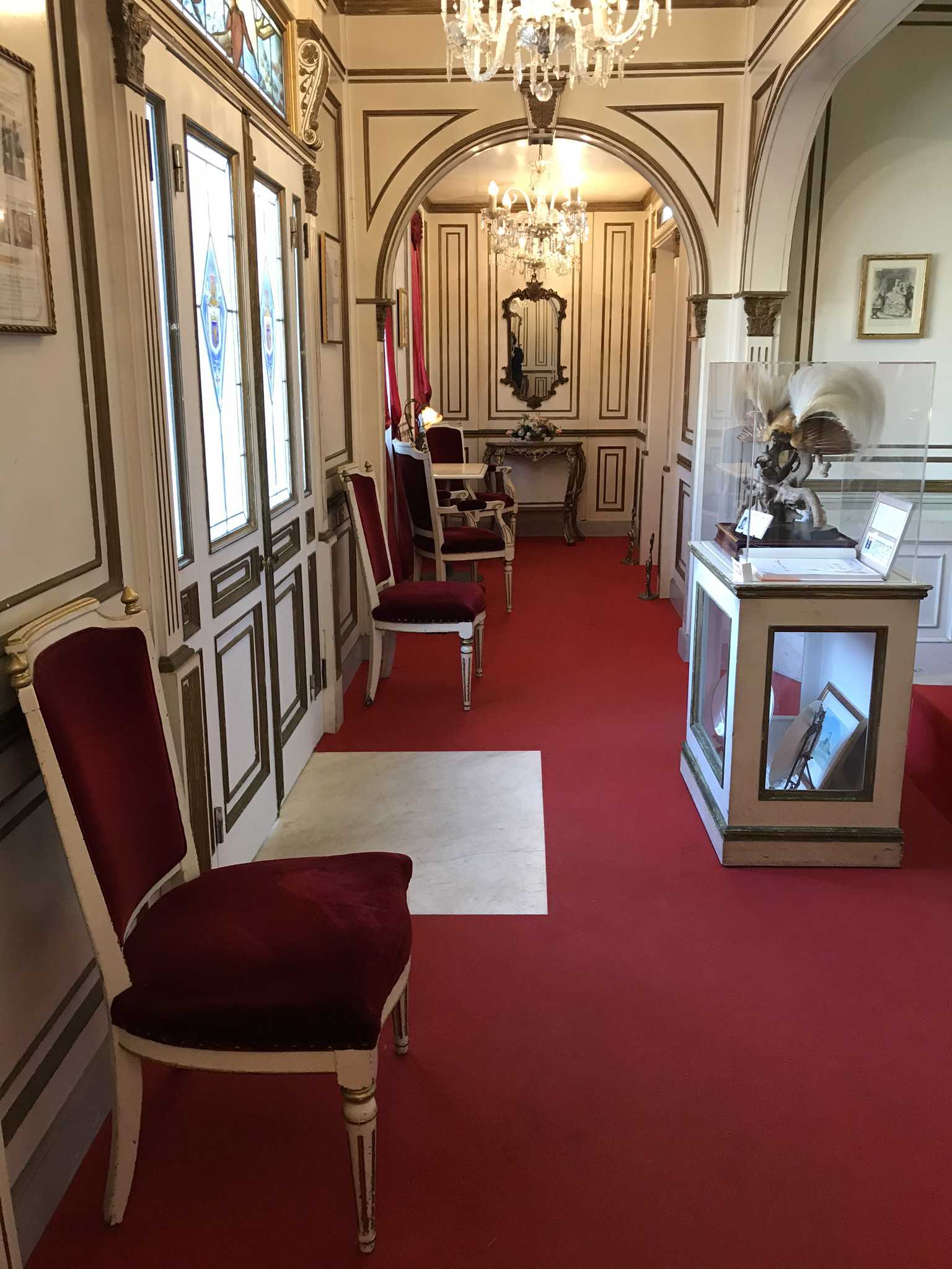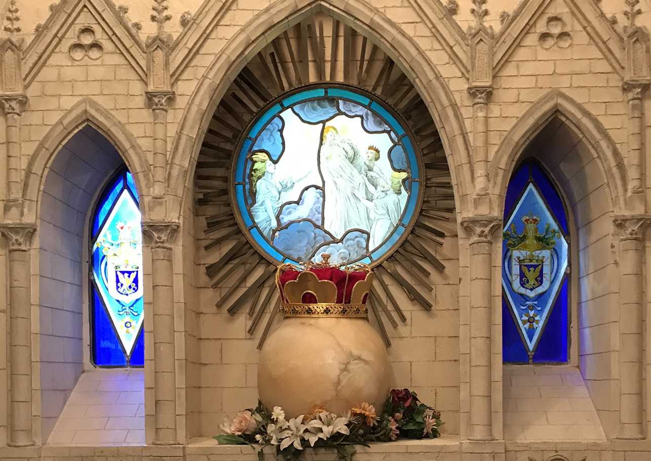 一画には礼拝堂が出現。ステンドグラスには玄関のガラス窓と同じコーマル城の紋章が描かれています。この紋章は、ブルトゥィユ家の紋章や高丸家の花菱の家紋などを合わせて、高丸氏自らデザインしたものだそうです。