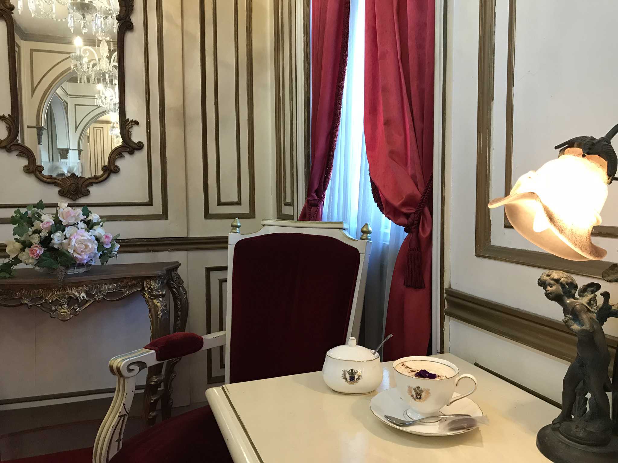 見学の後はカフェでひと休み。オリジナルメニューはカフェモーツァルト、カフェ利休、カフェポンパドールの3種。チョコレートリキュール入りのカフェポンパドール600円は、スミレの花がのってとても華やか!カップにはお城の紋章が入っています。