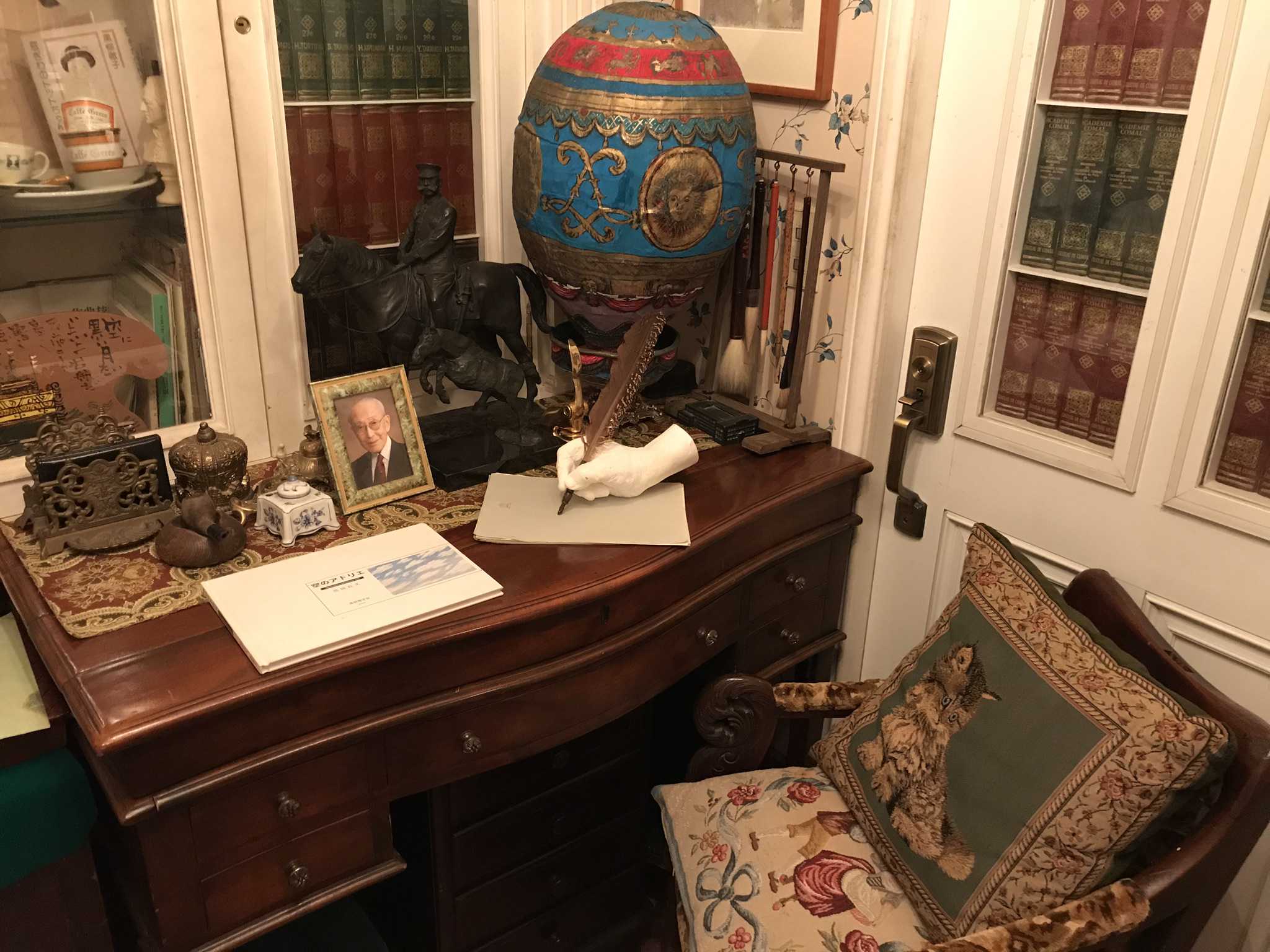 フタ式文具机や城主自ら彫刻した木彫りの椅子などが置かれた書斎と図書の間。ゴブラン織りのクッションはブルトゥィユ家からの贈り物だそう。城内には、フランスとの交流の品がたくさんあります。