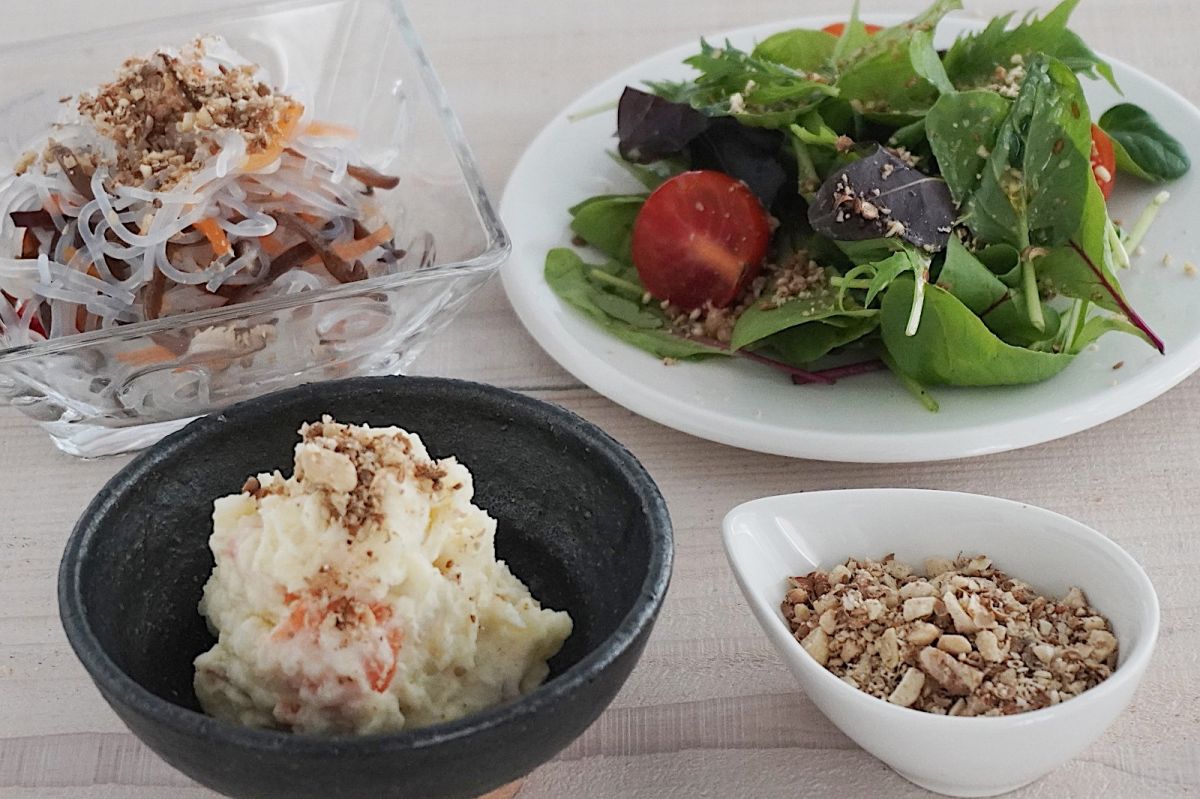 グリーンサラダ、ポテトサラダ、春雨サラダなど。ザクザクとした食感がアクセントになり、ナッツのコクやスパイスの香りも合わさり、味わいに深みがでます。