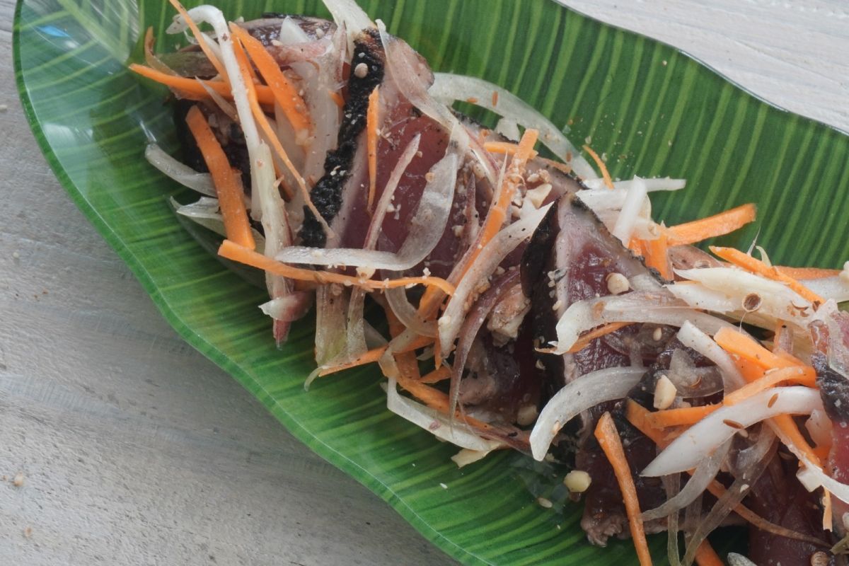 お刺身だけど野菜もいっぱいとれるし、ナッツのカリッとした食感が加わって、ペロリと完食!スパイスの香りがプラスにされることで、生魚の匂いが苦手という人でも、きっとおいしく感じられますよ。ハマチやタイなどのお刺身にも合います。