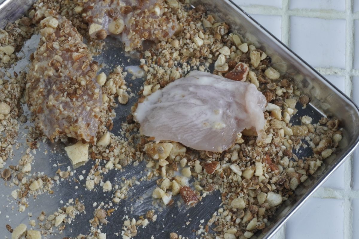 水で溶いた小麦粉(1:1くらい)に切ったササミをくぐらせ、デュカをくっつける接着剤にします。