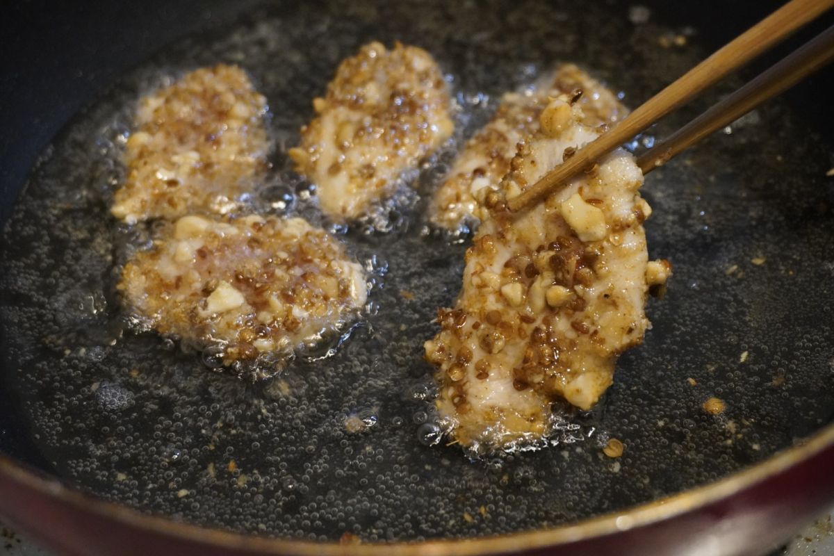 油の分量はフライパンに1〜1.5cmほどで十分。ナッツやスパイスは焦げやすいので、高温での調理は避けましょう。表裏各1〜2分ほど揚げて、中まで熱が通れば完成です。