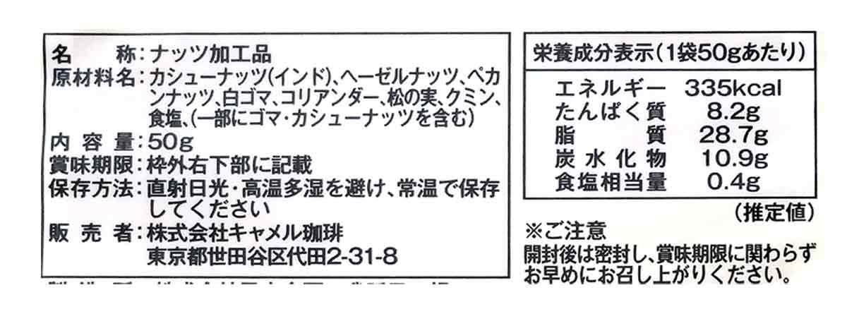 カルディオリジナルの「デュカ」50g 442円には、カシューナッツ、ヘーゼルナッツ、ペカンナッツ、白ゴマ、コリアンダー、松の実、クミン、食塩が入っています。ナッツのザクザク感と、クミンやコリアンダーのエスニックな風味が魅力です。