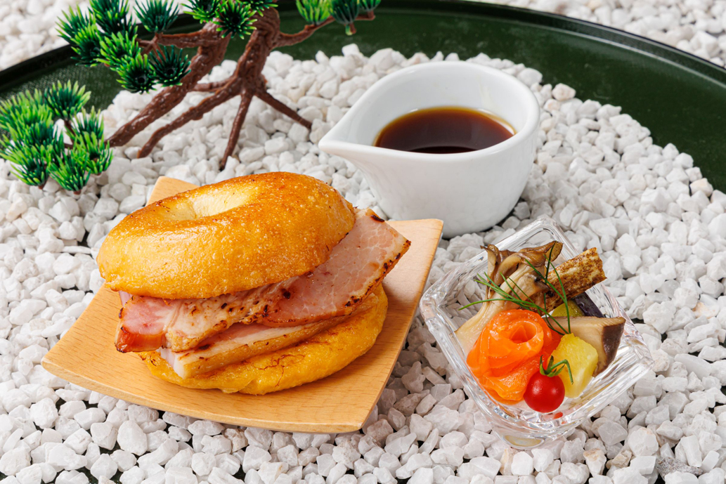・ベーグルで作るフレンチトースト 焼きベーコンにシナモンと黒コショウのアクセント