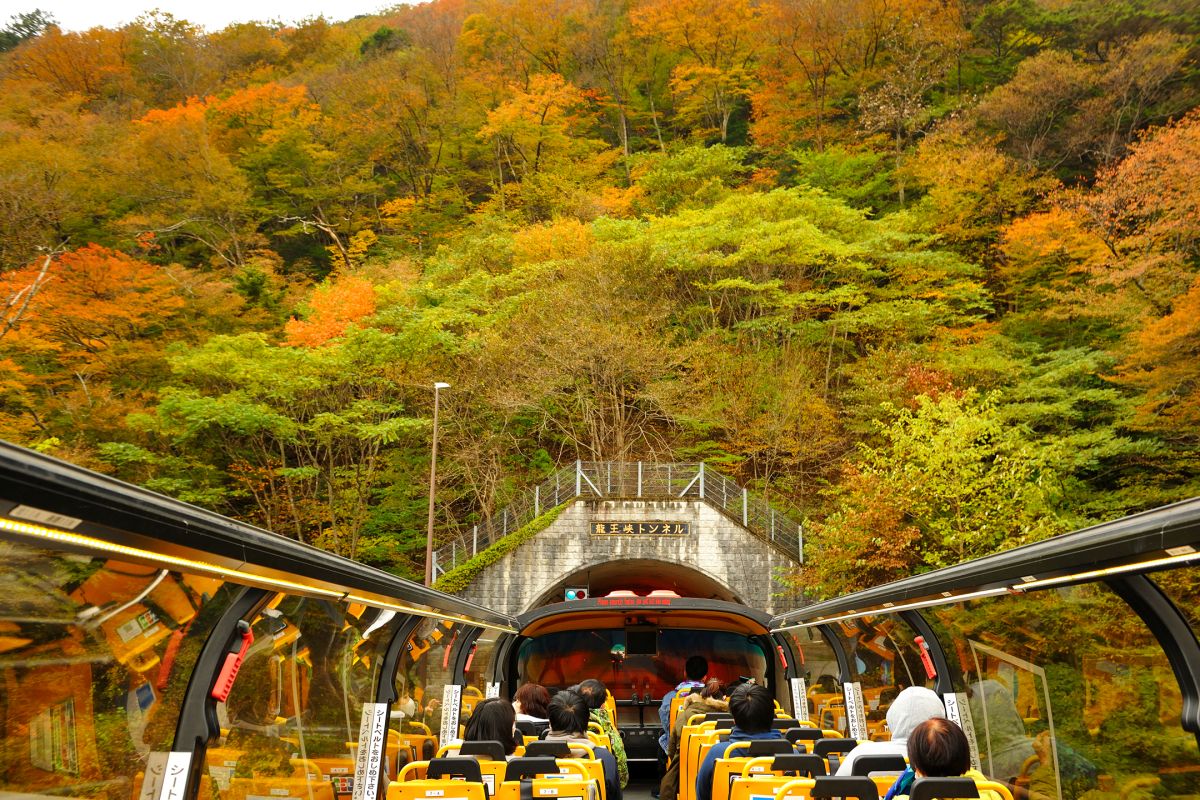 混雑知らずの紅葉が楽しめると人気のこのツアーで利用するのは、圧倒的な開放感が味わえるオープンエアのバス。屋根がないため、色づいた紅葉を間近に見ることができます。景色やさわやかな風、森の香りを楽しめるようゆっくりと走行してくれるのもうれしいポイントです。