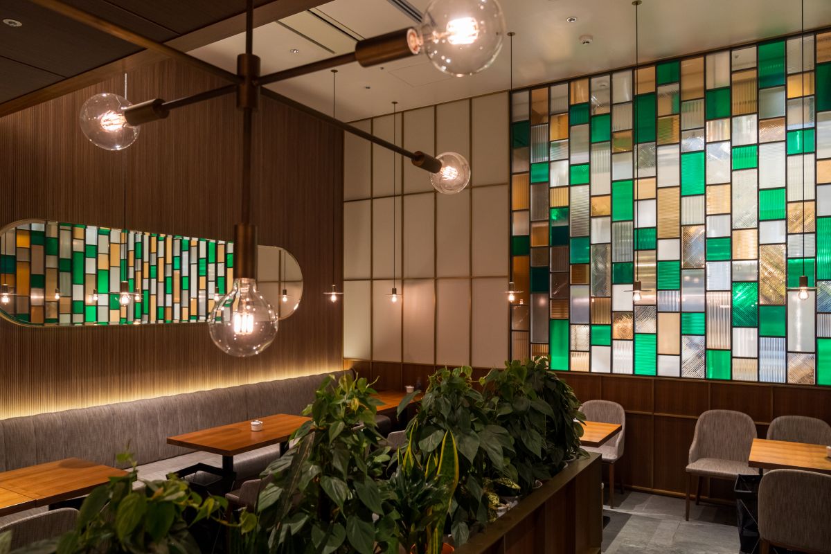 モロゾフの出来立てスイーツをイートインできる「カフェ モロゾフ」は全国に20以上もの店舗を構えています。なかでも神戸本店に併設されたカフェはステンドグラスの鮮やかさと間接照明を用いた意匠が落ち着いた雰囲気を醸し出し、高い天井の42席を擁する広々した空間で優雅なカフェタイムを楽しむことができます。