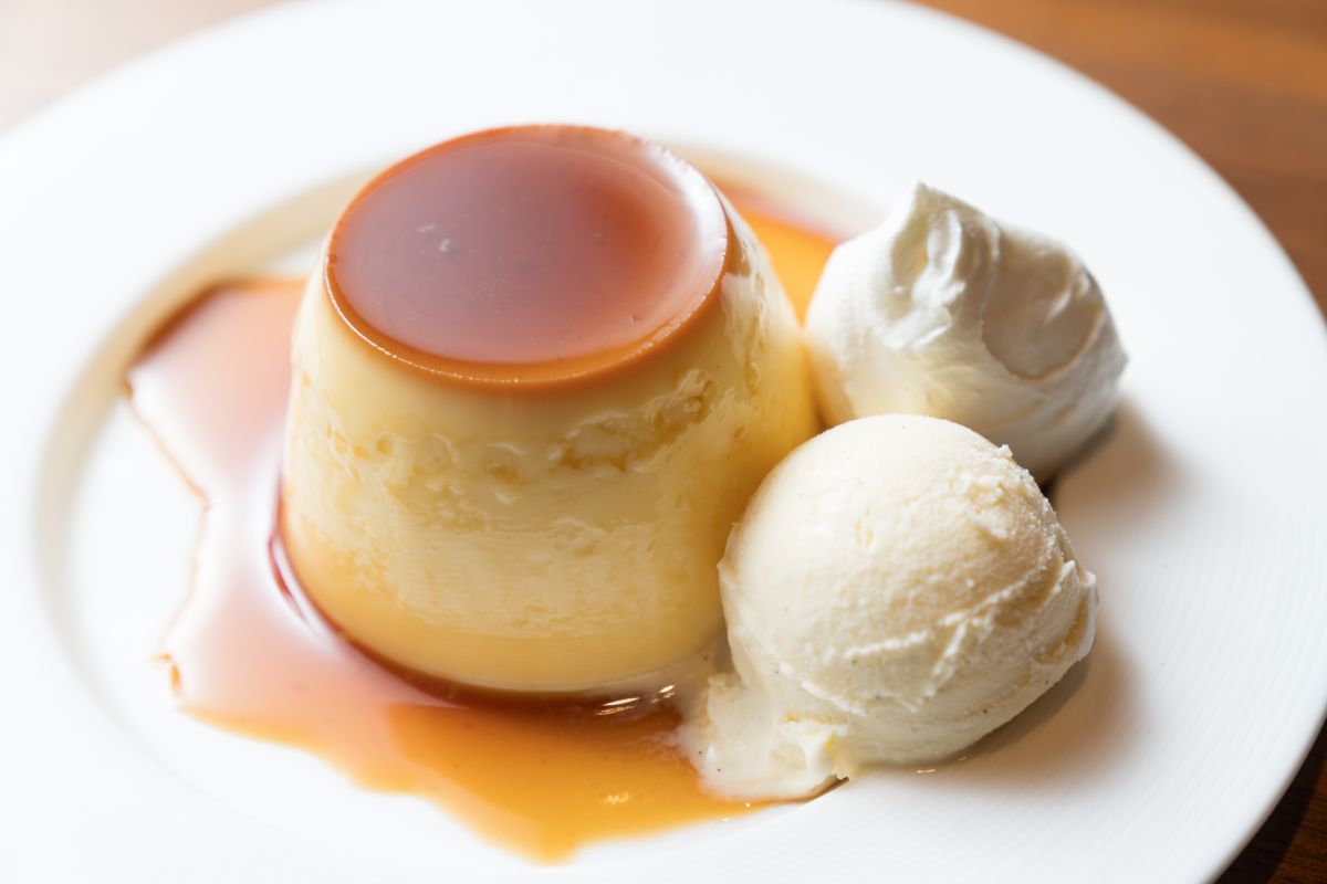 まずは、「カスタードプリンとお飲み物」1320円。どこか懐かしいビジュアルのプリンは一口含めばカスタードの風味が口いっぱいに広がり、ほどよい弾力と食感がやみつきになります。横に添えられたバニラアイスクリームとホイップクリームで二度、三度と味の変化が楽しめます。