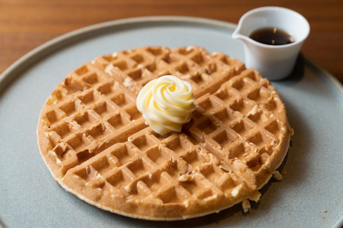 カフェのメニューの中でも定番として長年愛されているのが「アーモンドワッフル(ホール)とお飲み物」1375円。絶妙な火加減で焼き上げられたワッフルは、カリッとした表面とふんわりした中の食感のコントラストが抜群です。アーモンドの香りも食欲をかきたて、メープルシロップ&バターをかければホールでも瞬く間に食べ終えてしまいます。