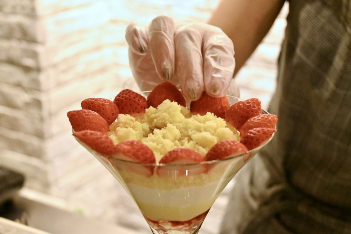 こちらのお店では、時期によって品種を変えながら、一年を通してイチゴを使ったメニューを提供しています。“オトナかわいい”をお店のコンセプトとしていて、おいしくて見た目もかわいいイチゴをメニューやロゴに採用したそう。また、店長の吉田さんは、イチゴの生産地として知られる栃木出身で、イチゴへの思い入れにも並々ならぬものがあるのだとか。そんなこだわりのイチゴを新鮮なうちにふんだんに使ったパフェをいただきました。
