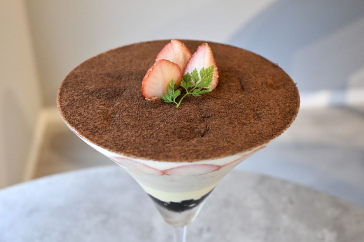 コーヒーが混ざった、ほろ苦いココアパウダーがたっぷりトッピングされた「苺のティラミスパフェ」。ティラミスクリームには、「ペルノ」というハーブ酒が入っていて、独特のさわやかな香りを感じることができます。