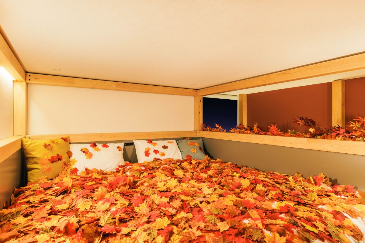 紅葉した木を設え、ベッドももみじでいっぱい!2段構造になっているヤグラ寝台の1階のソファや2階のベッド部分も、色鮮やかな絨毯のようにもみじに埋め尽くされていて、まさに“紅葉まみれ”の部屋に♪
