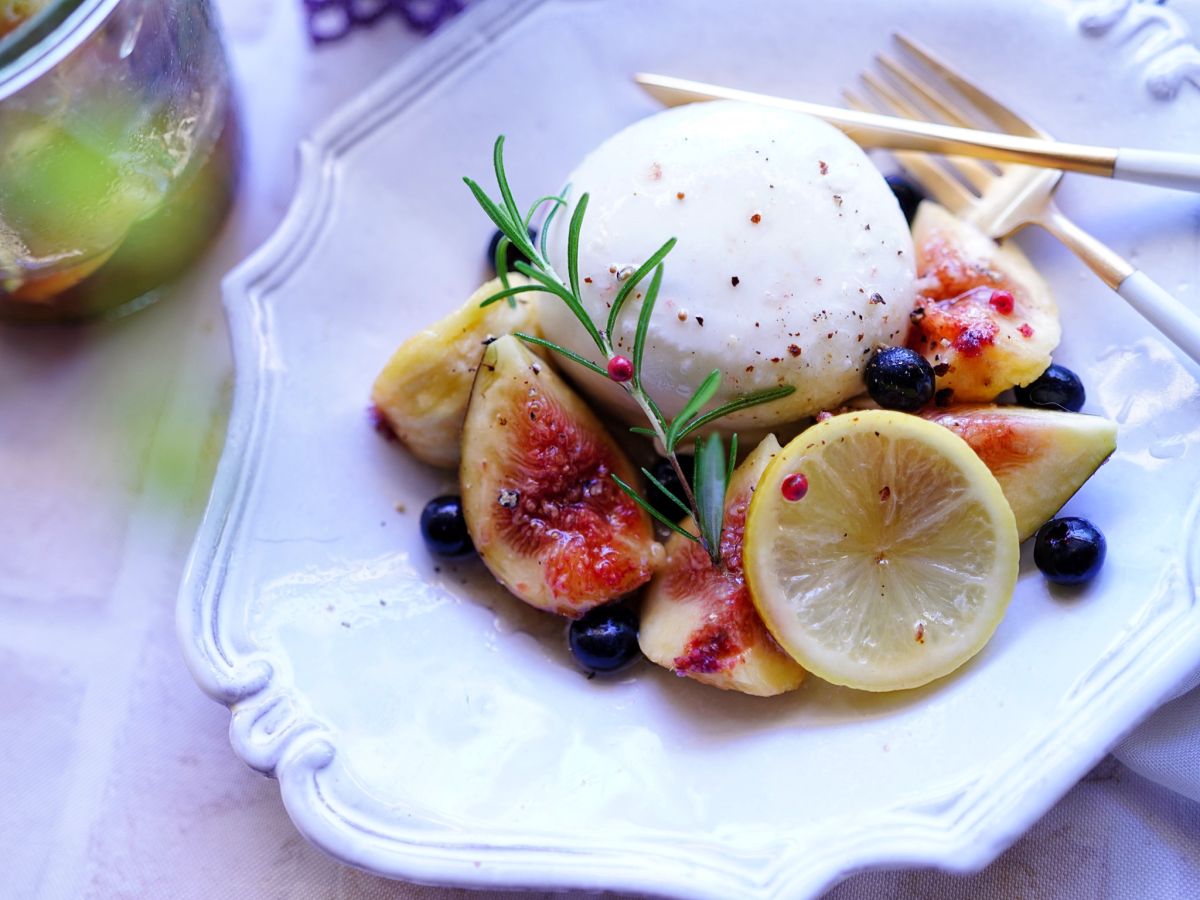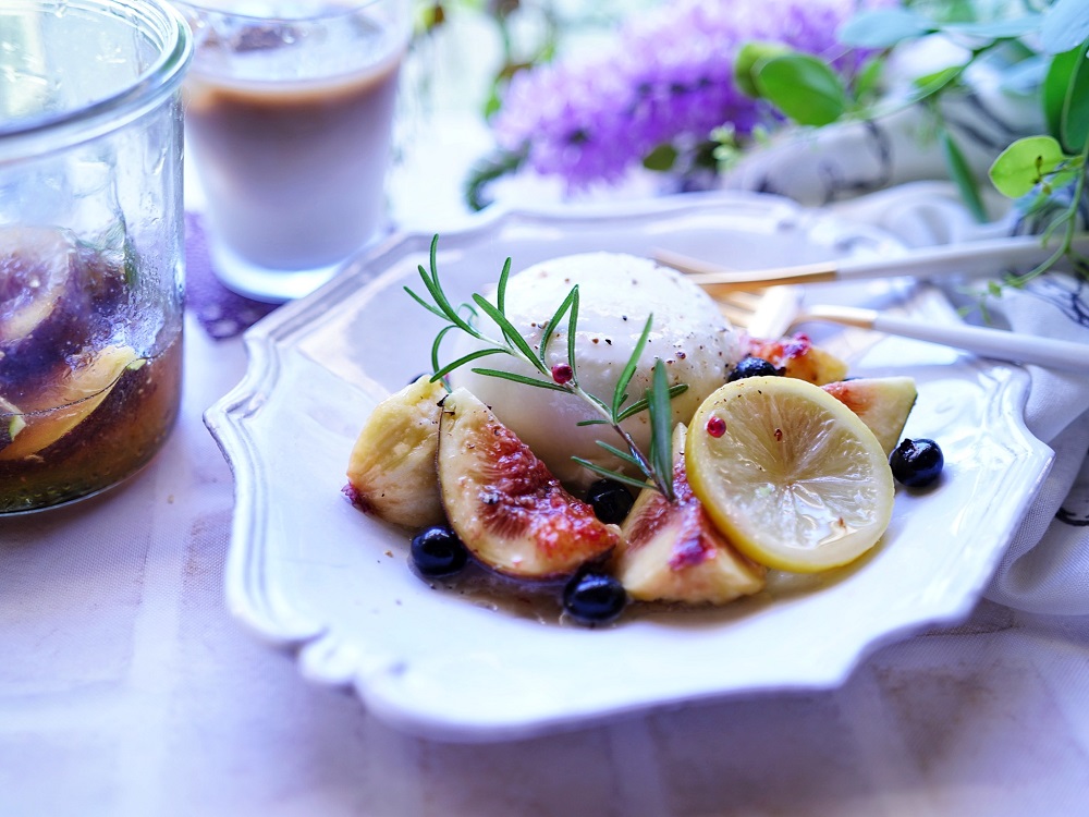| イチジク…2個 ローズマリー…2本 ピンクペッパー…10粒(なければブラックペッパーでも) レモン…輪切り1枚 はちみつ…適量 ブッラータ…1個 ブルーベリー…適量 黒胡椒…適量 |
