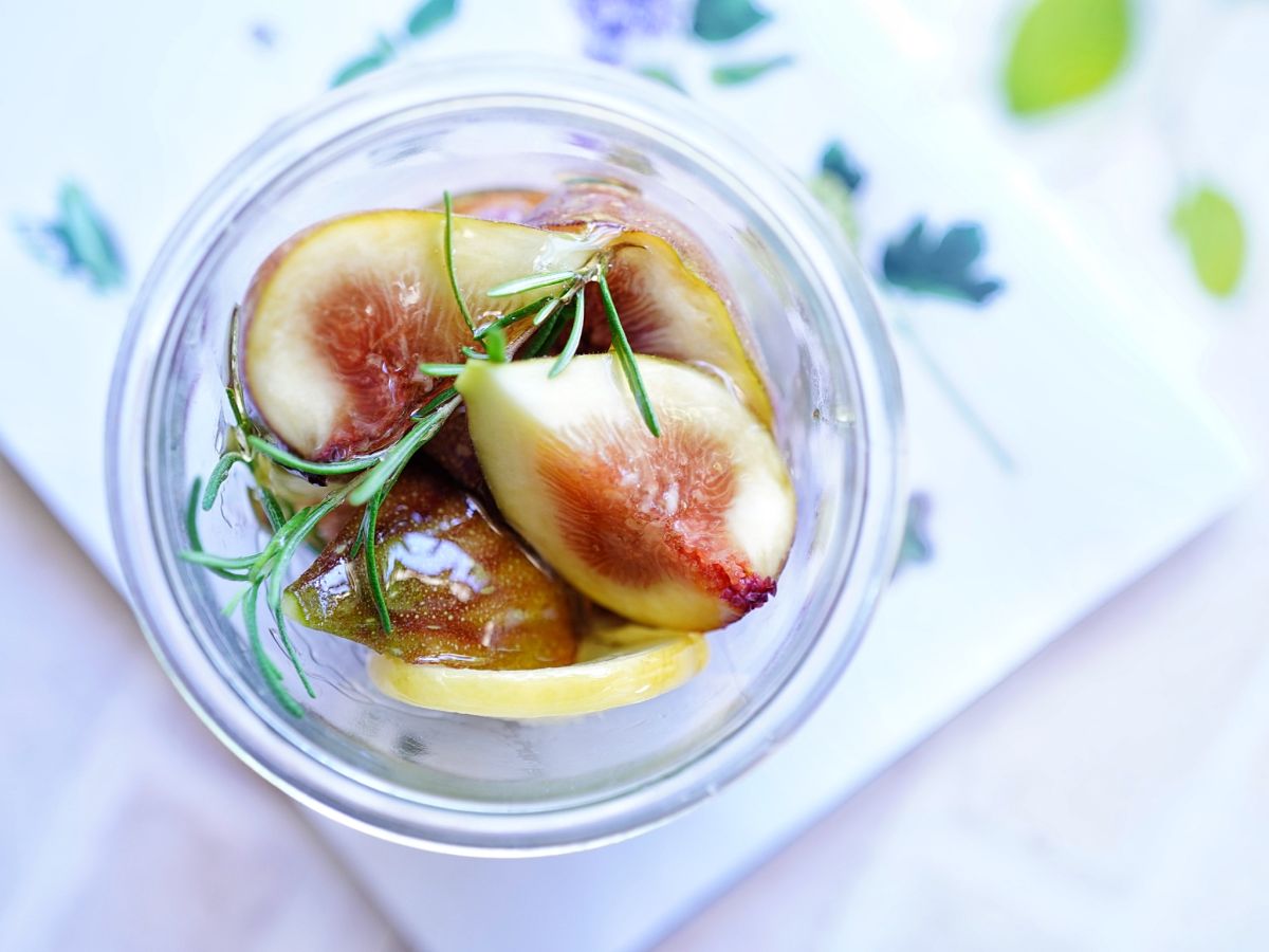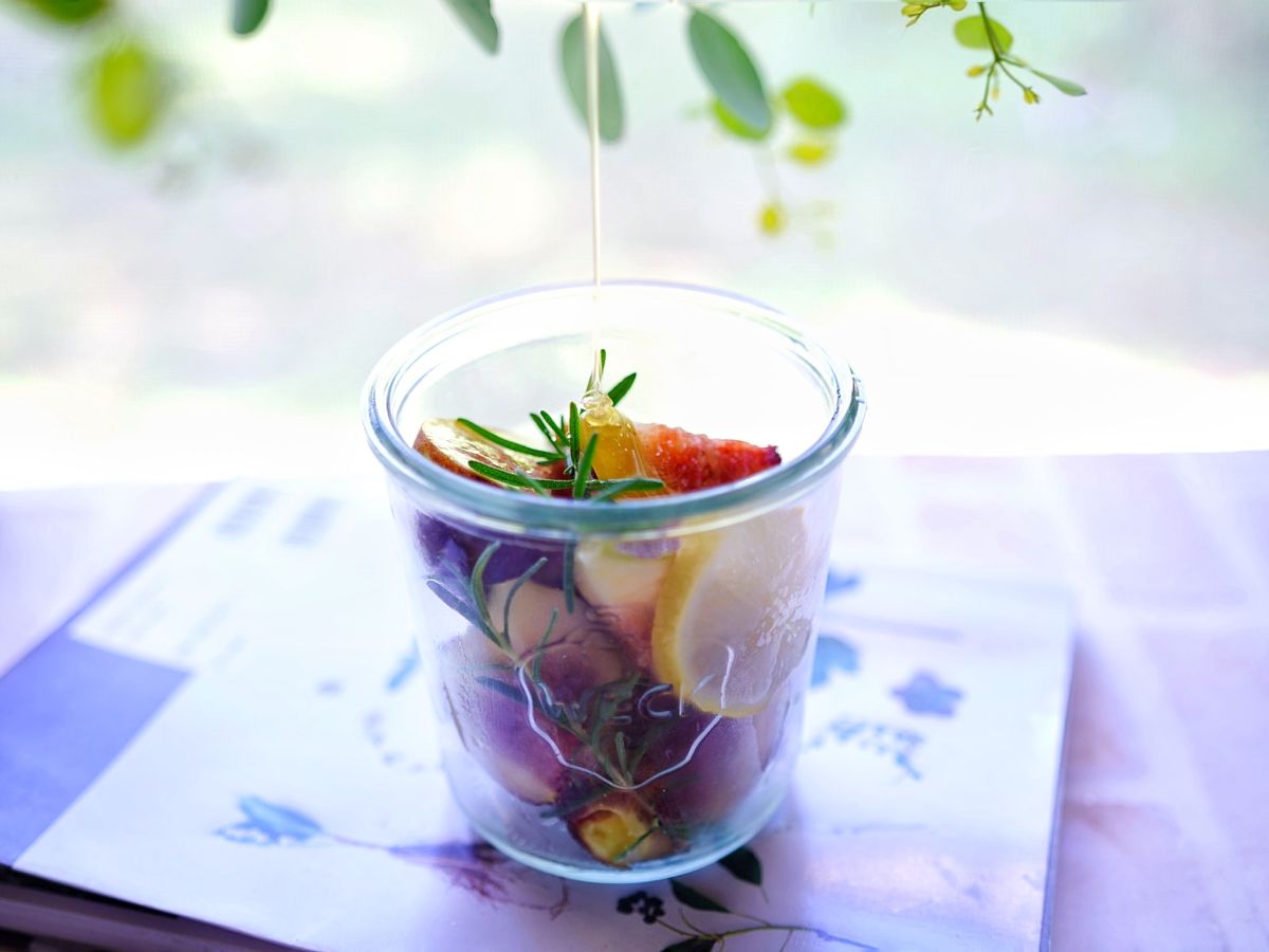 イチジクは皮つきのまま縦に4等分し、ローズマリー、ピンクペッパー、レモンとともに容器に入れ、はちみつを回しかけます。