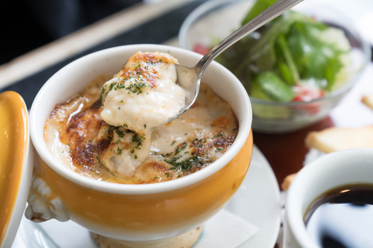 注文から約15分かけて調理されたグラタンは熱々の状態でテーブルに到着。スプーンで表面を破って中身をすくい上げると食欲を刺激する香りが漂ってきます。そのまま食べても良いのですが、カリッと焼き上がったトーストにのせると、おいしさが倍増。慌ててかぶりつき、口の中をやけどしないように注意しましょう。