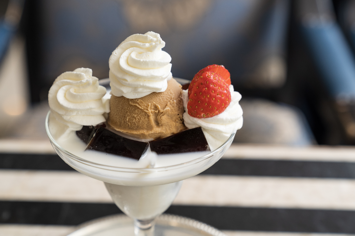 食後のデザートには「モカ・ペア」900円を。にしむら珈琲店の定番デザートとして長年愛されている一品です。ぷるんとしたコーヒーゼリー、アイスクリーム共ににしむら珈琲店のコーヒーが使用されており、生クリームと合わせることでほどよい甘さが口いっぱいに広がります。いちごの赤が映えるビジュアルがキュートで、写真を撮るお客さんも多いのだとか。