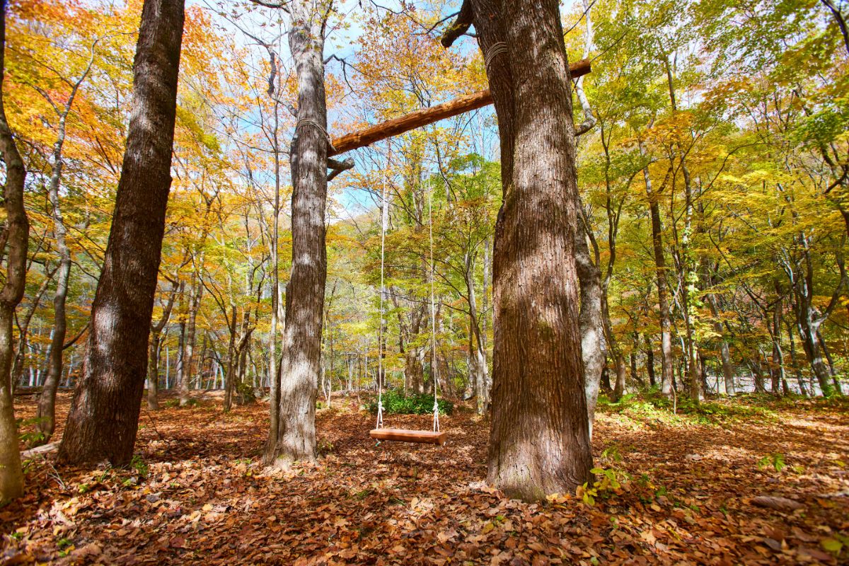 朝7時から⼣⽅16時までいつでも好きなときにブランコに乗ることができるため、朝露に濡れたきらきらとした紅葉や、⼣⽇に照らされてオレンジ⾊に包まれた景⾊を楽しめます。また、近くを流れる渓流からはせせらぎが聞こえ、360度広がる⼤⾃然を⾝近に感じることもできます。宿泊者限定の無料アクティビティなので、こちらもぜひ体験してみてください。