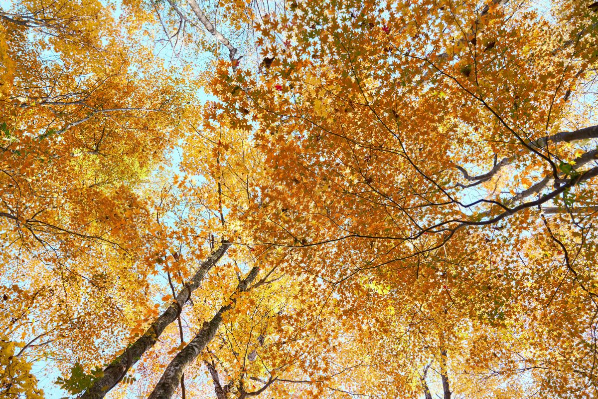 頭上には⾦⾊に輝くブナをはじめ、柔らかい橙⾊に染まるハウチワカエデや鮮やかな⾚⾊に染まるヤマモミジなど、⻩⾦⾊や朱⾊などさまざまな⾊が織りなす錦秋の景⾊が広がります。