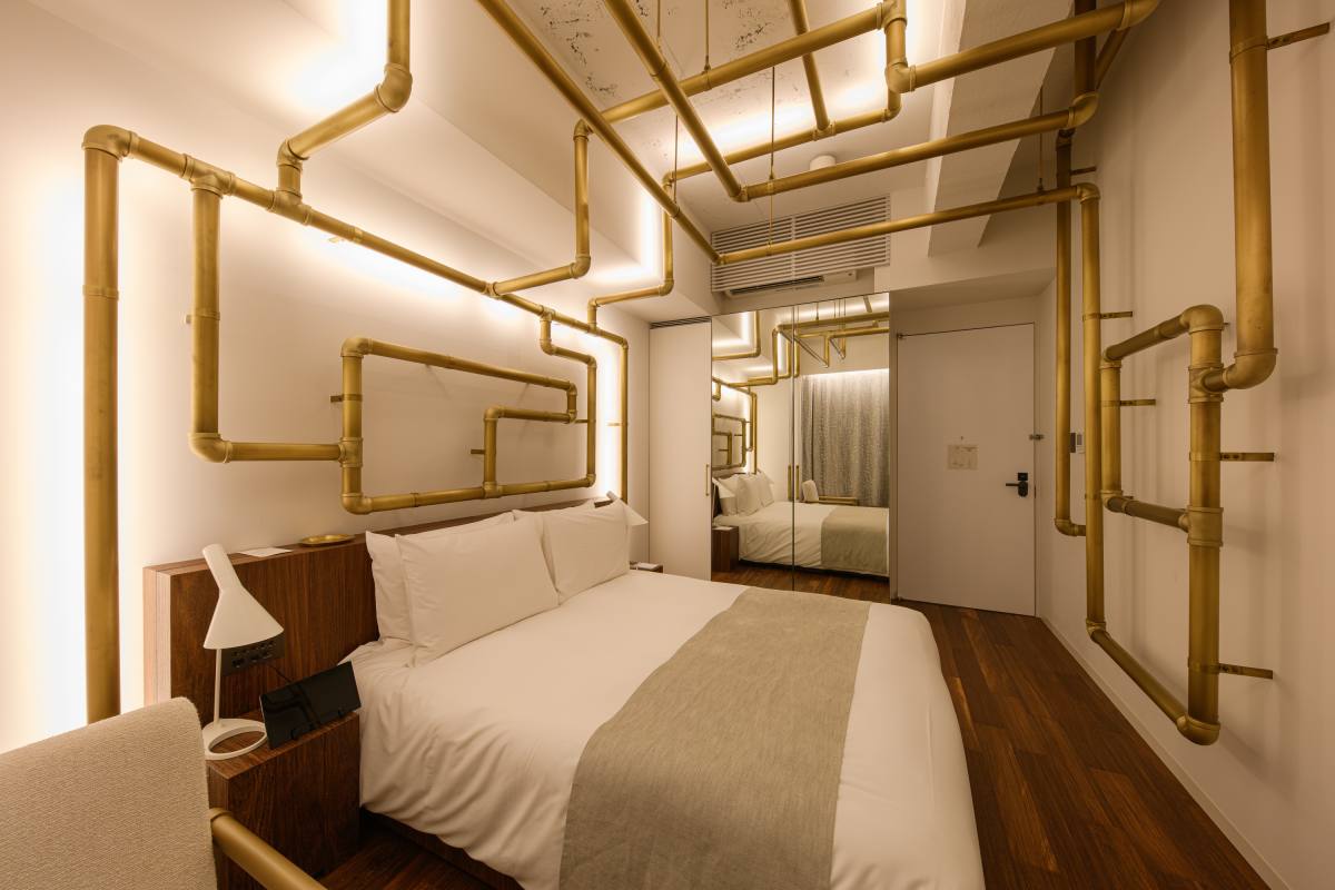 吹き抜け部分の『Lighting Pipes』を手がけたエルリッヒ氏がデザインしたスペシャルルームは、なんと部屋の中にまで配管が!枕元の壁や天井にまで配管が張り巡らされており、「泊まれるアート」といえそうです。部屋自体はスーペリアルームやデラックスルームよりもコンパクトな設計ですが、その分、360度の全方向から配管が迫り来るような感覚で、アートそのものに没入することができます。