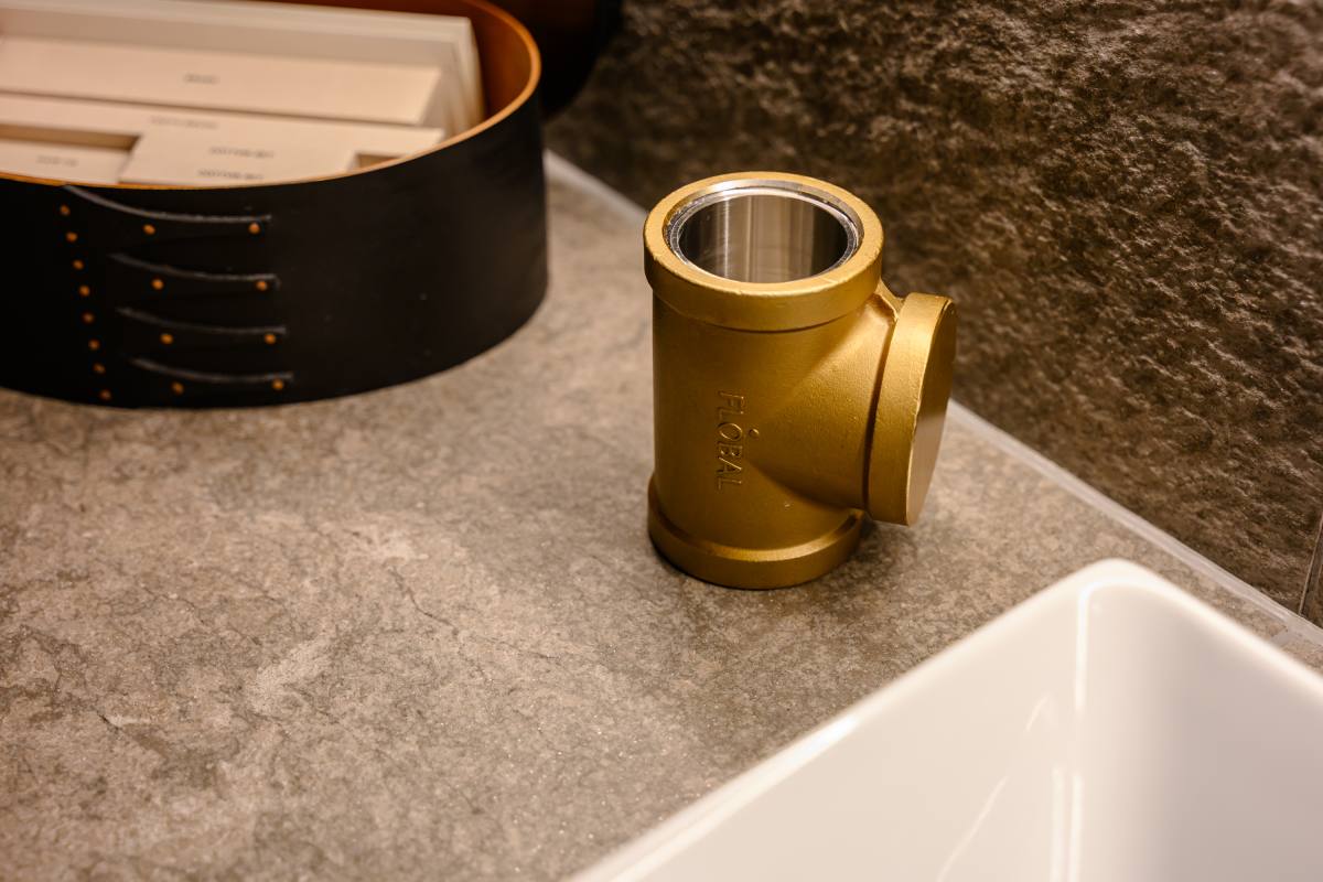 パウダールームにもエルリッヒ氏の遊び心が表れており、歯ブラシ立てが配管のデザインになっています!かわいらしくちょこんと鎮座していますが、持ってみると想像よりもかなり重くてびっくり!