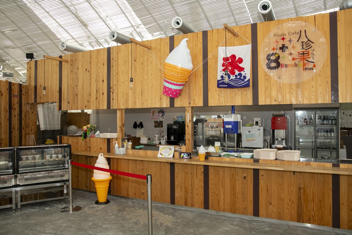 「くだもの広場」の中に2023年4月にオープンした「フルーツカフェ八珍果+(はっちんかぷらす)」。「甲州八珍果」とよばれる「ブドウ、梨、桃、柿、栗、リンゴ、ザクロ、クルミ」にサクランボやイチゴ、スモモ、ブルーベリー、キウイフルーツなど、季節ごとに旬の果物をプラスしてオリジナルスイーツやソフトクリームを提供しています。