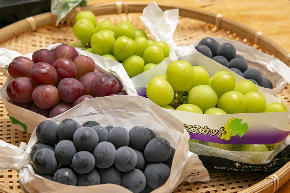 7〜9月はシャインマスカットや巨峰といった新鮮なブドウが店頭に並びます。フルーツはJAから直送されるので鮮度抜群!シャインマスカットを親にもつ赤系ブドウ「スカーレット」(写真左上)といった珍しい品種が並ぶことも。種がなく皮ごと食べられるので人気上昇中のおすすめ品種です。