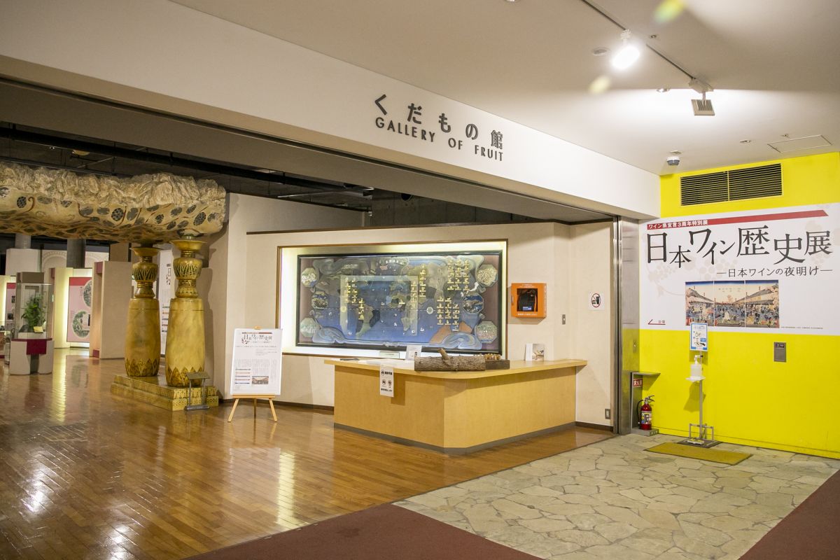 大きなドームの「くだもの広場」の中にある「くだもの館(展示室)」では、ゲームを通して果物について学べたり、果樹農業や甲州ブドウの歴史に関する動画を上映しています。現在「日本ワイン歴史展ー日本ワインの夜明けー」を開催、ブドウ栽培やワイン造りの歴史や資料を展示、日本のワイン史に残る偉人も紹介しています。日本ワインの奥深いストーリーに触れてみては。(展示期間 2024年3月31日まで)