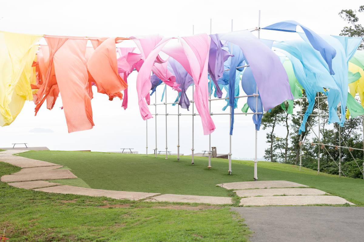 展望デッキのそばにある虹のカーテン。カーテンにはびわこ箱館山がある高島市の伝統工芸品、高島ちぢみを約200枚使っています。風に揺れる様子が美しく、思わず写真を撮りたくなりますね。高島市は虹の発生率が高いそうで、その特性を虹色のカーテンで表しているそうです。