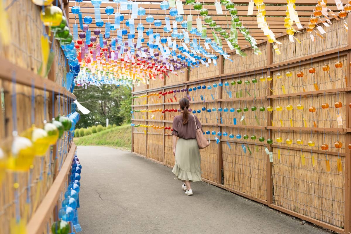 風鈴のよし小道は、約882個の虹色の風鈴と、びわ湖の浜辺に生える葦(よし)を使ったすだれでできています。風が吹くとチリンチリンと鳴る風鈴の音が涼しげです。