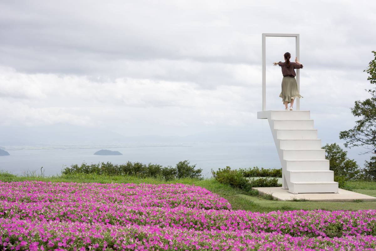 こちらのピンクの花は桃色吐息(ペチュニア)。夏から秋にかけて咲くので、びわこ箱館山オープン期間中はほとんど見ることができます。鮮やかなピンクの花とびわ湖とのコントラストが見事! 桃色吐息のそばにある階段、ステアーズフラワーに登って撮影すると、幻想的な写真が撮影できますよ。