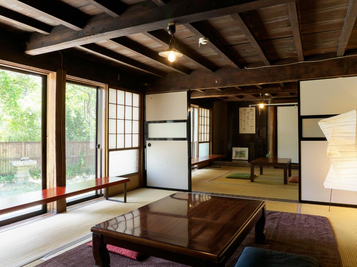 1階は座敷やテーブルのある板の間など、開放感のある造り。自然の中でゆったりとした時間の流れを楽しんでもらいたいと、テレビは置いていません。室内は柔らかい風合いの照明のみで、昼は自然光、夜はほのかな明かりという自然に近い状態。縁側に座って空を見上げれば、四季折々の山の景色と風、野鳥のさえずりなど、全身で自然の豊かさを感じることができます。