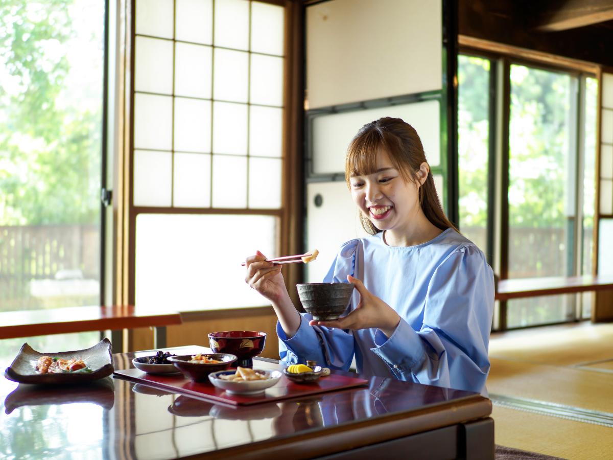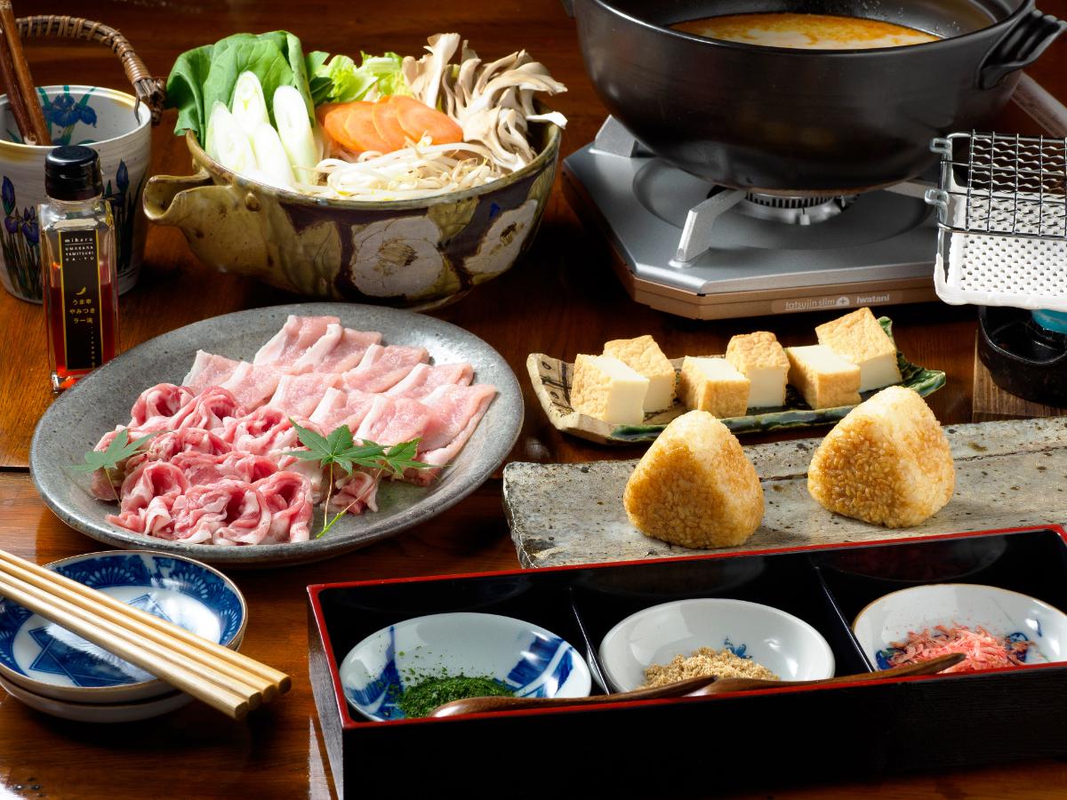 夕食は別途予約すれば、地場野菜をたっぷり使った「豆乳鍋」を味わうことができます。コクのある豆乳出汁に豚肉と野菜のうま味が加わり、濃厚な味わいが自慢。隣町で作られている特製ラー油や、青のり、すりごま、サクラエビの3種の薬味で味の変化を楽しむのもおすすめです。しょうゆと出汁を使った焼きおにぎりを軽く炙ると、部屋が香ばしい香りに包まれます。