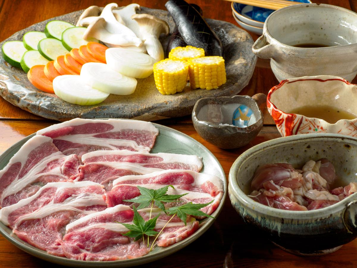 「炙り焼き」タイプの夕食を選ぶことも可能です。肉は豚肉と鶏肉の2種類。しょうゆダレ、塩ダレの2種と宮城県産の藻塩を付けていただきます。室内の炭火焼きができるテーブルでいただくので、天候を気にせず、バーベキュースタイルで味わえます。