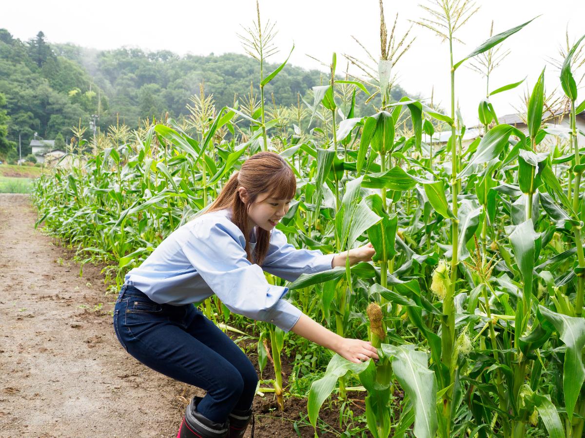 宿から車で約5分。「古民家宿 柚子のあぜ道 雨乞のかえる」の紹介で訪れた「葉坂構造改善センター」の近くの畑で野菜の収穫に挑戦。この体験は、地元の生産者が開催している地域密着型のイベント。この日は食べ頃を迎えていたトウモロコシ畑に案内してもらいました。「このあたりがおすすめかな。好きなところをもいでいいですよ」と生産者の青柳さんがやさしくとり方を教えてくれます。畑の土や植物の香りに包まれながら、自分でトウモロコシを収穫する時間は、日常では味わえない経験です。畑の奥の方にも入るので、汚れてもいい服装で参加しましょう。