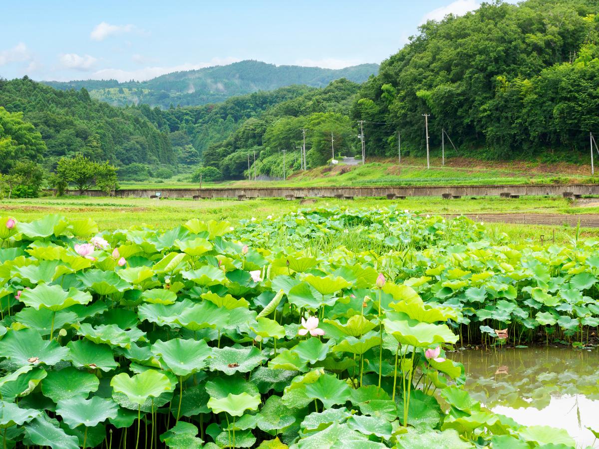 スタート場所の「農村環境改善センター」から田園風景の中を歩いていくと、美しい蓮田に出合いました。蓮の見頃は7月下旬~8月下旬。桜や紅葉、季節の草花を眺められるのもフットパスの魅力です。各コースでルート設定はあるものの、時間や見るポイントなどは気にし過ぎず、目に入った風景や風の匂いを楽しみながら自分のペースで楽しむことがおすすめです。