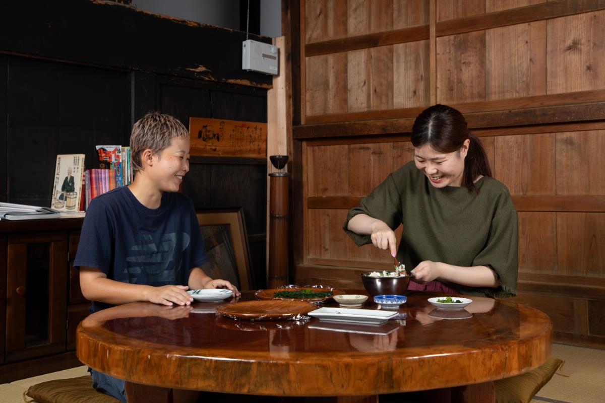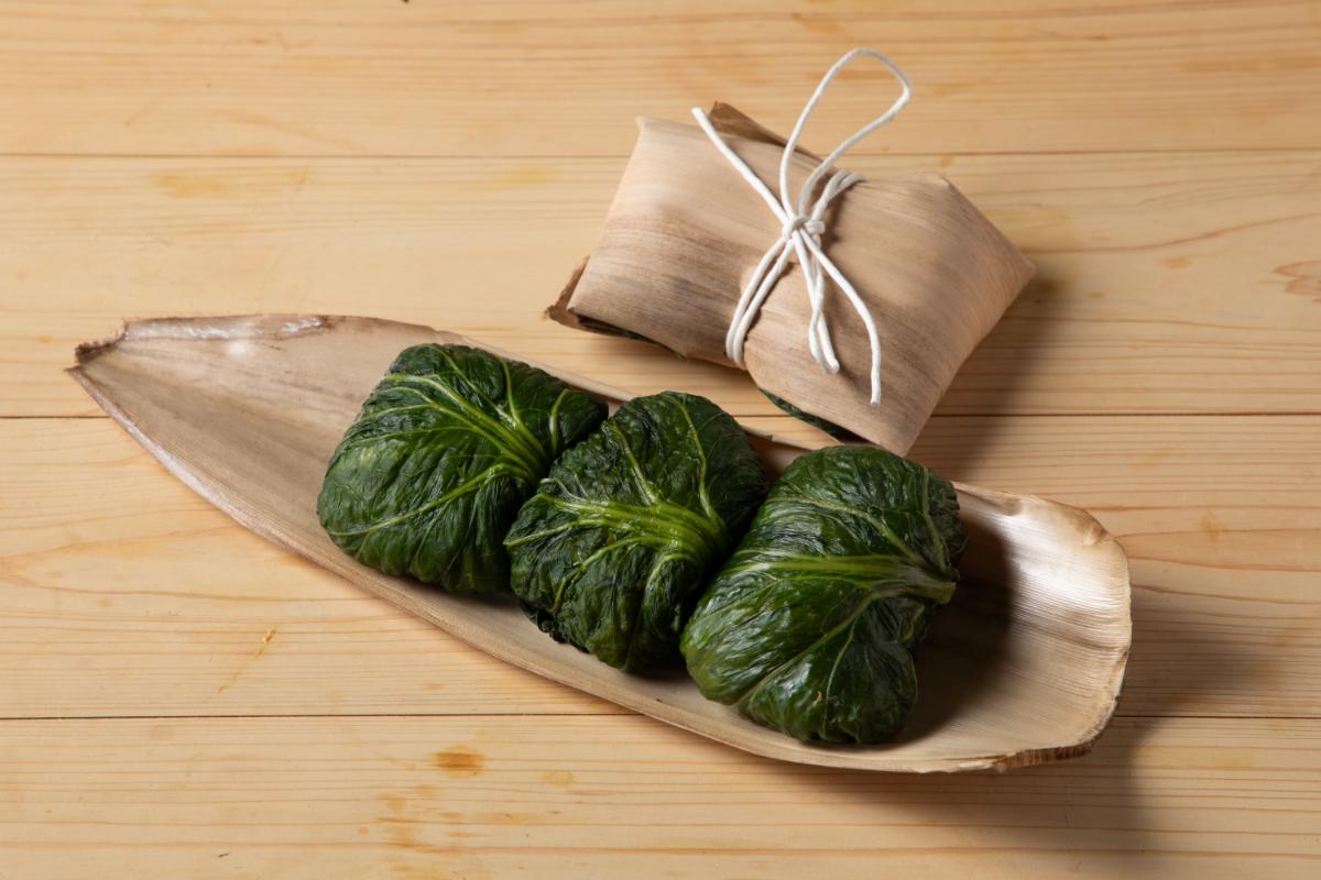 味付けした米を高菜の葉で包みます。このとき、高菜の葉をしっかりと広げるのがポイント。包みやすいように丸く形を整えた後は、葉の中央に米をのせて左側から葉で包みます。左右を巻いたら上を巻き、最後は下から上に巻き上げると、あっという間に完成です。「めはり寿司」の名前の由来は「目を見張るほど大きくておいしい」こと(諸説あり)。大きさに圧倒されますが、塩味が絶妙でぺろりと食べられます。漁や農作業の人たちは、天候などで帰って来られなくなったときのため、保存がきく「めはり寿司」を一つ残して帰って来るという習慣があったそう。伝統料理を作りながら、豆知識なども教えてくれるスタッフとの会話も楽しみの一つです。