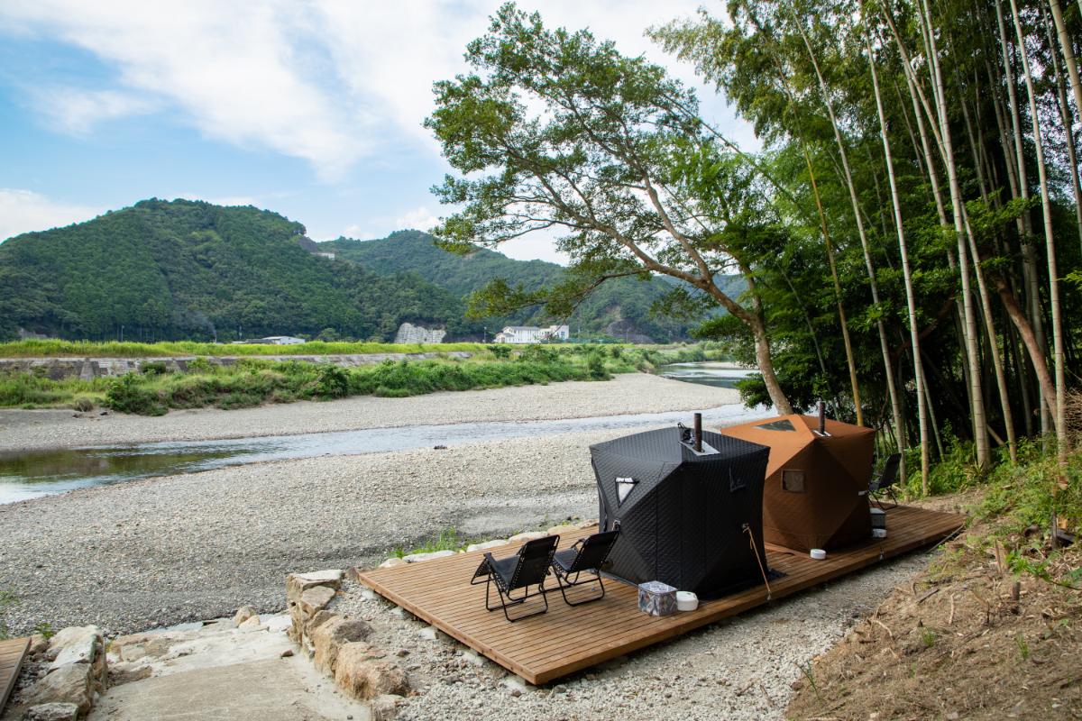 大泰寺にはお寺では珍しいサウナ 「リバーサイドサウナ」2時間5000円(要水着着用)もあります。住職によると「サウナでととのうは、坐禅で目指すところの悟りに近い感覚が得られる」とのこと。テントサウナは太田川の河川敷にあります。サウナでいい汗をかいた後は、目の前の太田川に入り、そのままテントのすぐそばのチェアに座って心身を整えます。リフレッシュにぴったりな体験。