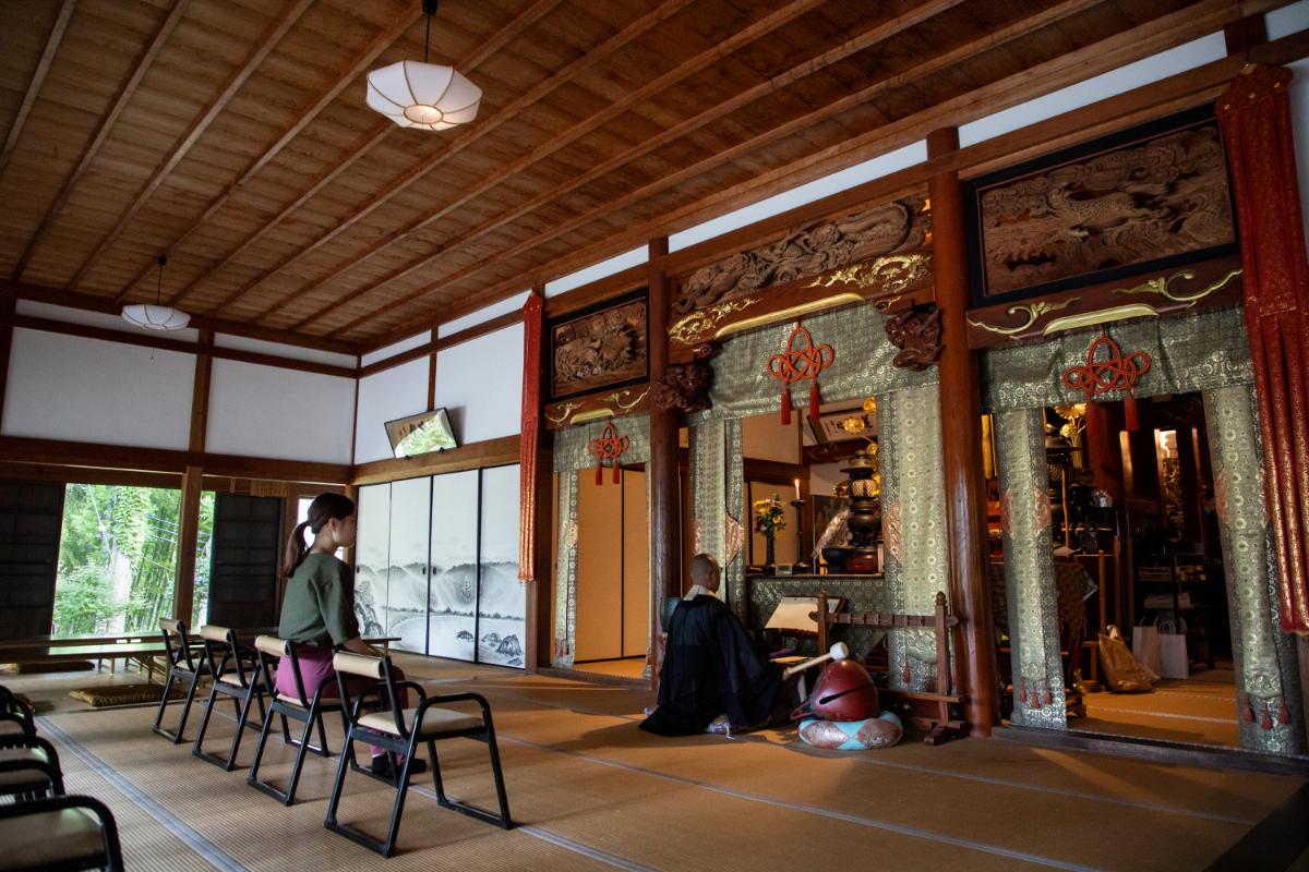 翌朝は毎朝6時から本堂で行われている「お勤め体験」からスタート。住職のお経に耳を傾けて心を無にしていると、なんともいえない晴れやかな気分になります。本堂でのお勤めの後は、本尊薬師如来を祭る薬師堂に移動してお勤めを。太鼓が使われるため、本堂とはまた違った雰囲気です。お勤めの後は住職に質問することができて、お堂内の装飾や仏像についても教えてもらえます。