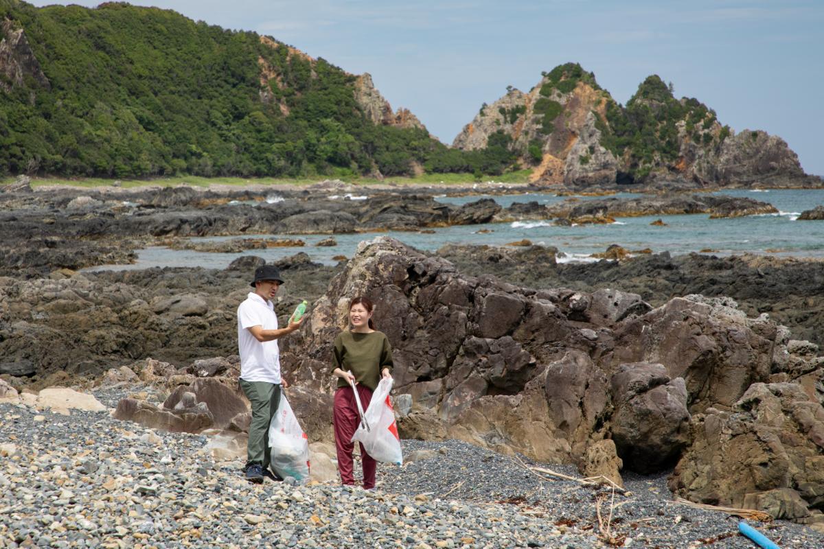 南紀のベニスといわれるほど青い空と海が美しい浦神湾(うらがみわん)。山を越えると太平洋の荒波が大きな音をたてる外海に出ます。大小様々な岩が連なる磯の探検と、美しいビーチを守るためのビーチクリーニングも「Temple Hotel 大泰寺」に宿泊すると体験できます。浦神地区へは車で移動し、車を降りた後はちょっとしたハイキング気分でビーチに向かいます。