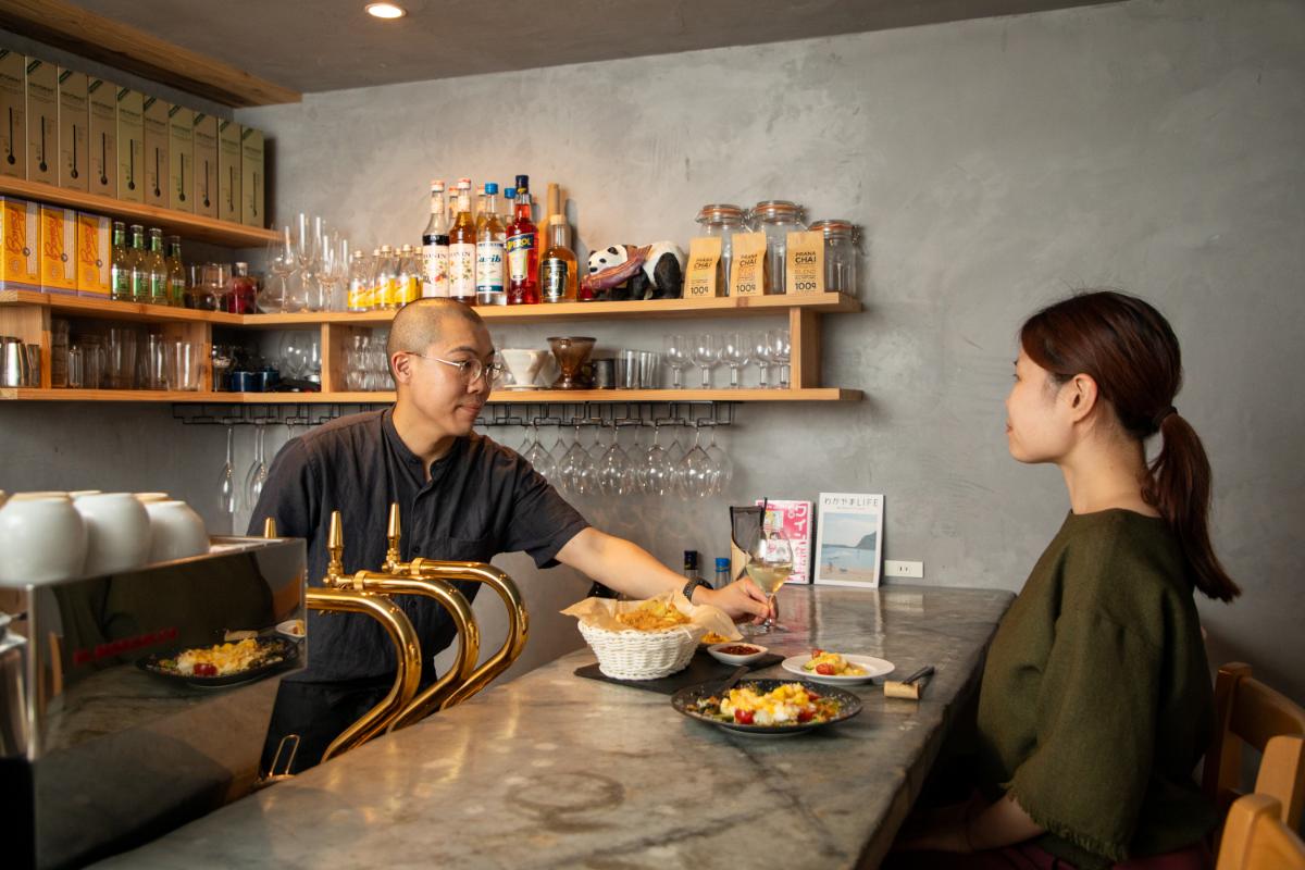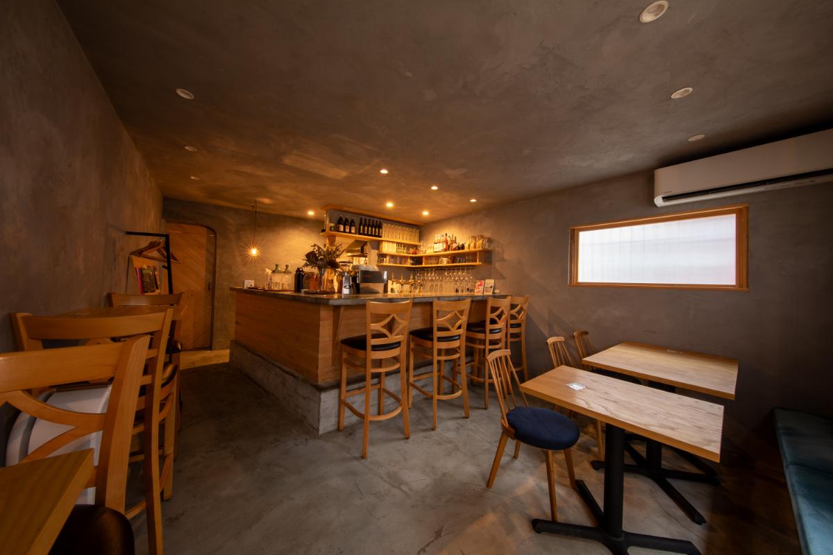 店内は熊野古道の石畳をイメージしたカウンター席が4席、テーブル席が10席。カウンターの奥に並ぶワインやジュースの瓶を見て「あれは何のドリンクですか?」とスタッフにおすすめを聞きながら注文を決めるのも楽しみの一つです。