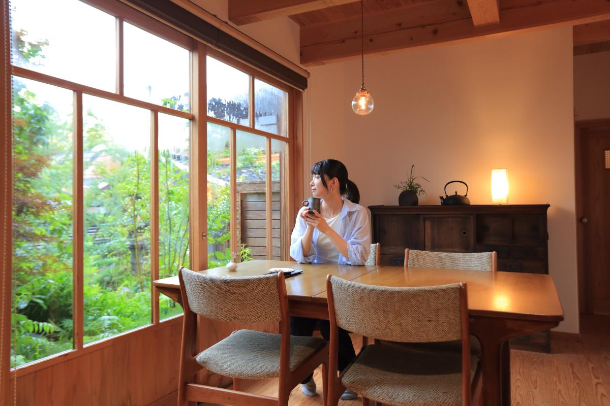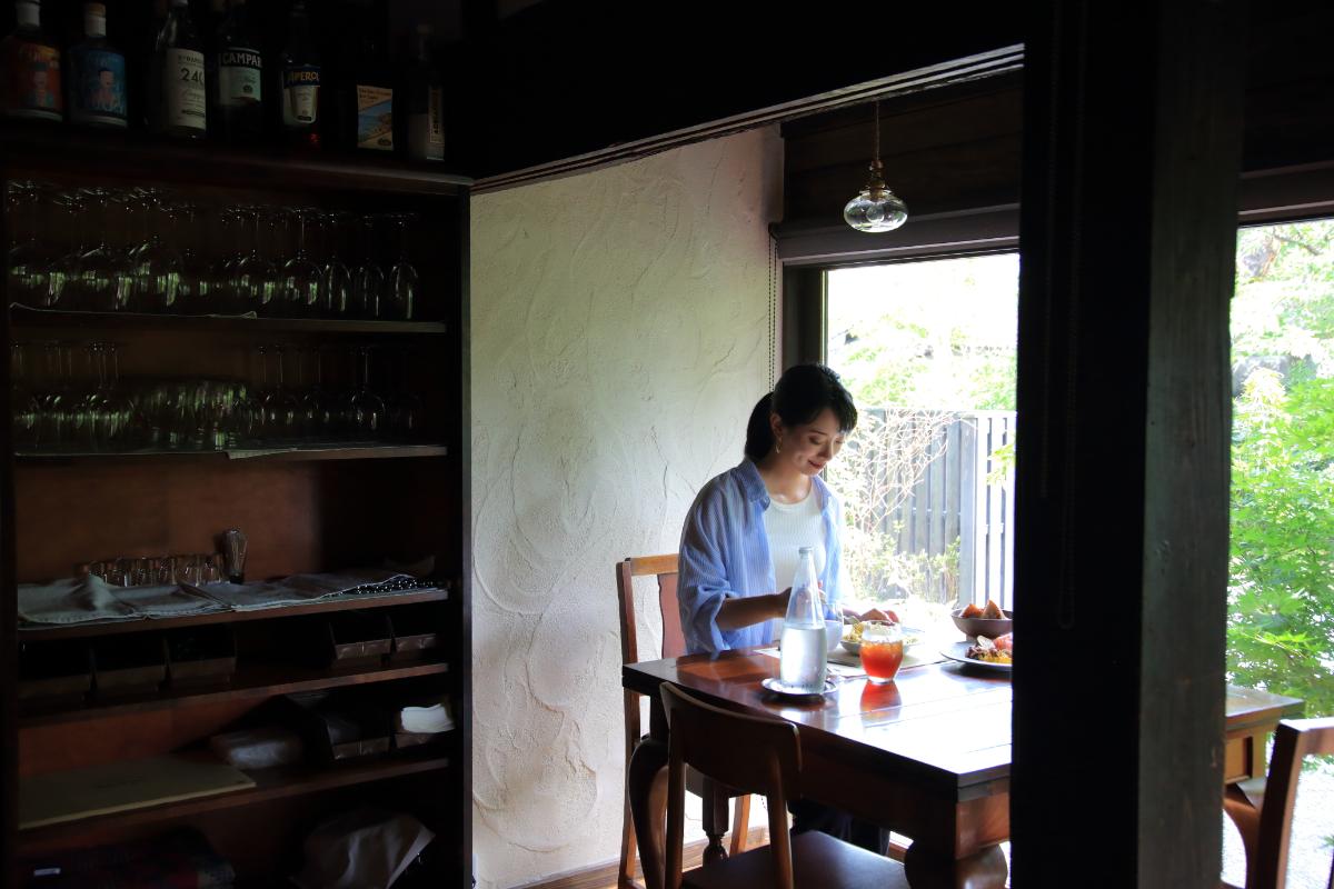 築140年以上の古民家をリノベーションした店内は、どっしりとした梁や高い天井が見事で、落ち着きのある雰囲気。窓の外は鮮やかな緑がまぶしく、長居したくなる心地よさです。家族や大切な人たちと特別な時間を過ごすのにいかがですか。
