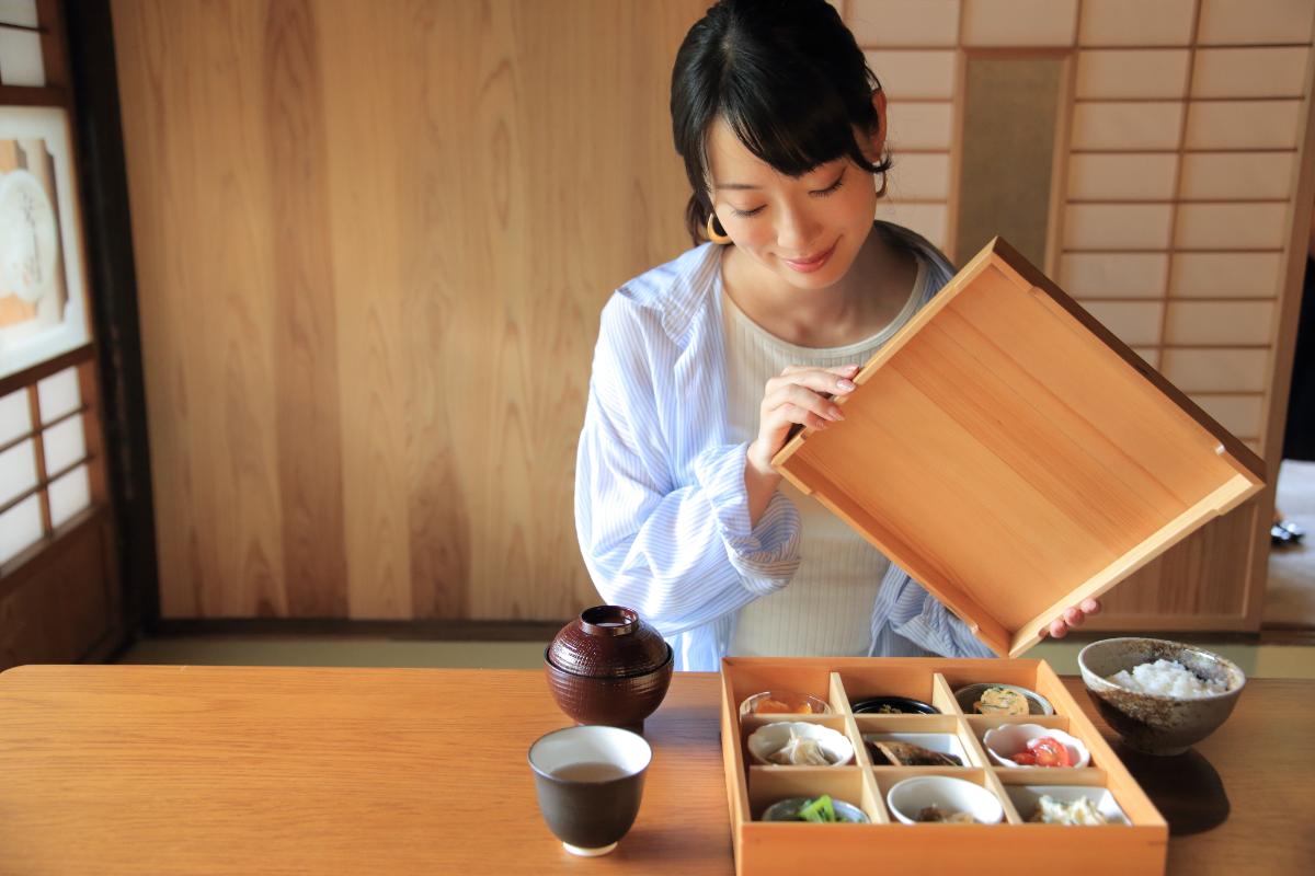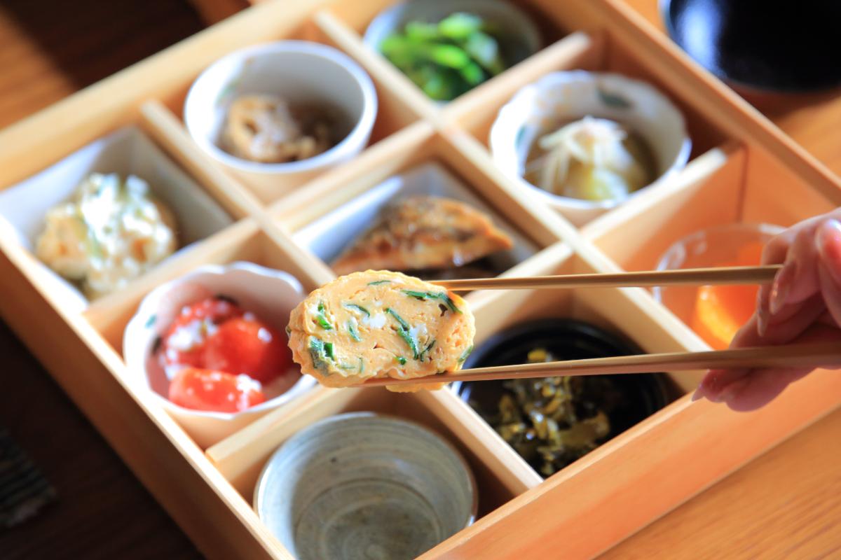 お楽しみの朝食は、甲佐産の炊きたてのご飯と出汁が利いた味噌汁、そして9種のおかずが入った松花堂弁当。甲佐特産の鮎で作った甘露煮のほか、地元のとれたて野菜を使用したおかずが美しく並んでいます。一品ずつ丁寧に調理されたおかずは、九州ならではの甘くてやさしい味付け。甲佐のめぐみがたっぷり詰まった総菜を満喫しましょう。