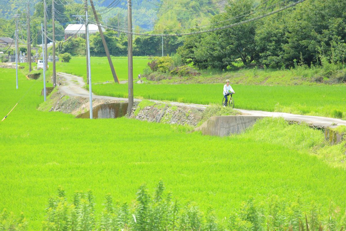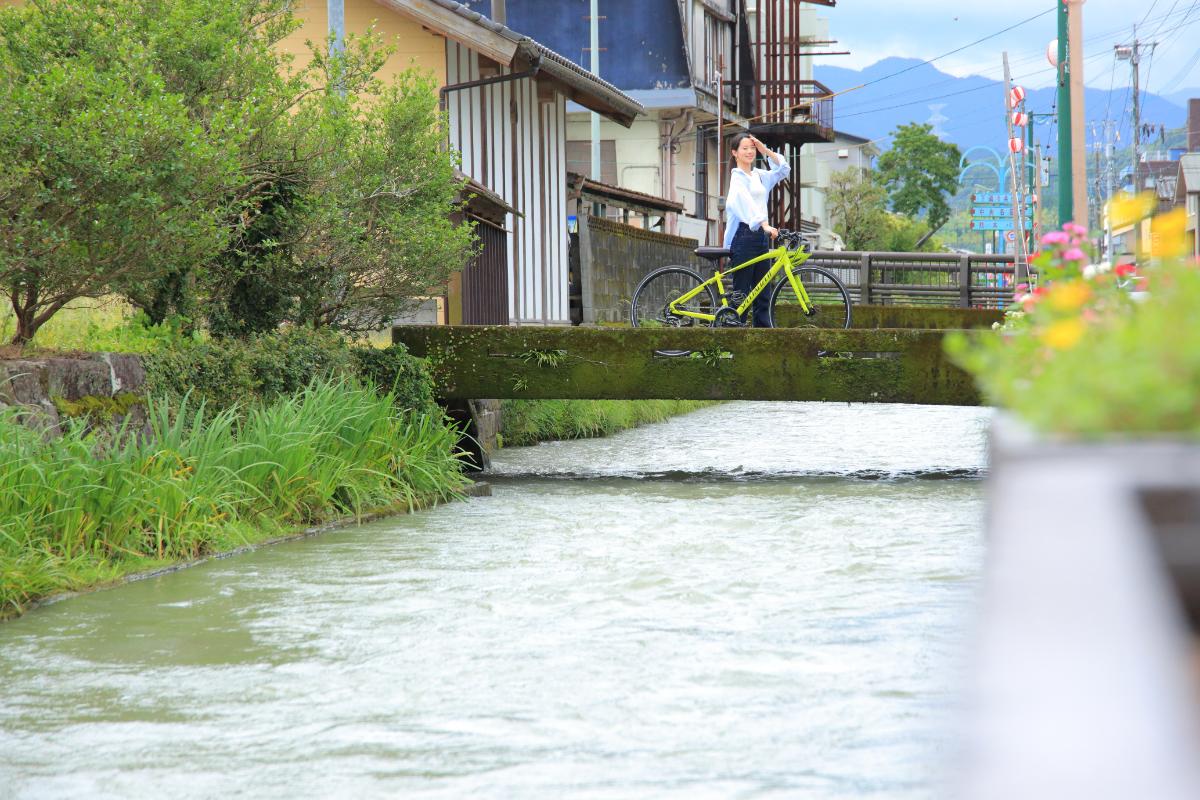 「NIPPONIA 甲佐 疏水の郷」のフロントで自転車とヘルメットをレンタルして、町をサイクリング。商店街や疏水沿いに自転車を走らせて町の造りを調べてみたり、田園脇を走って鮮やかな緑を眺めてみたり。川の上流まで足を延ばせば、水辺の美しい景色と出合えます。